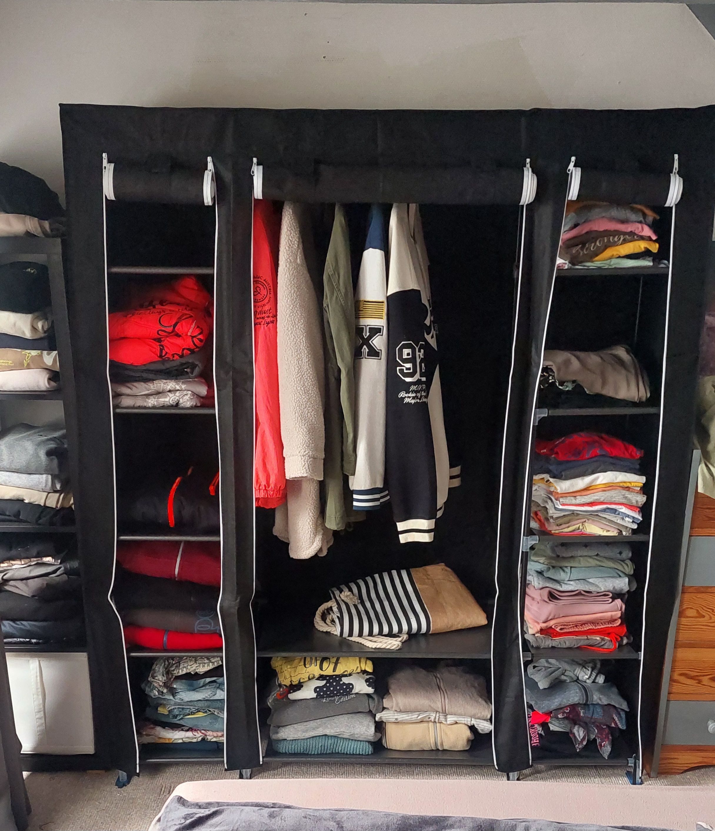 Der Grauton des Stoffschranks ist dunkel Anthrazit, genau - wie ich es mag ! Der Schrank lässt sich leicht zusammen bauen und im zusammen gebauten Zustand ist er stabil ! Auch der Überwurf ließ sich problemlos drüber ziehen! Es fehlte nichts es waren sogar ein paar Ersatzplastikzusammenstecker 🤪dabei❣️