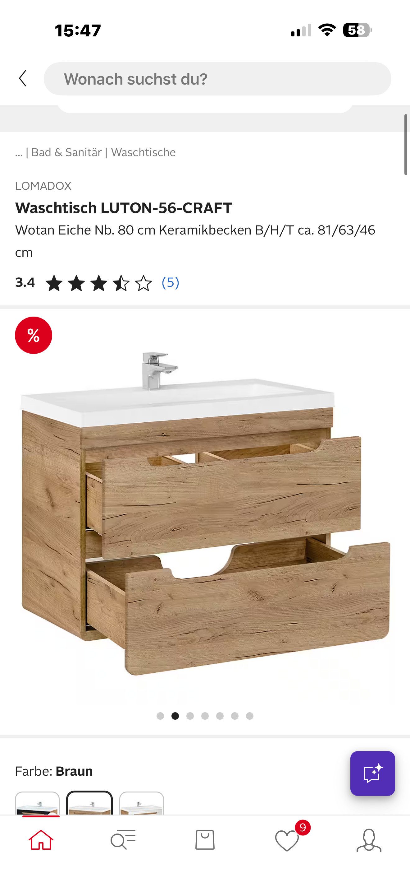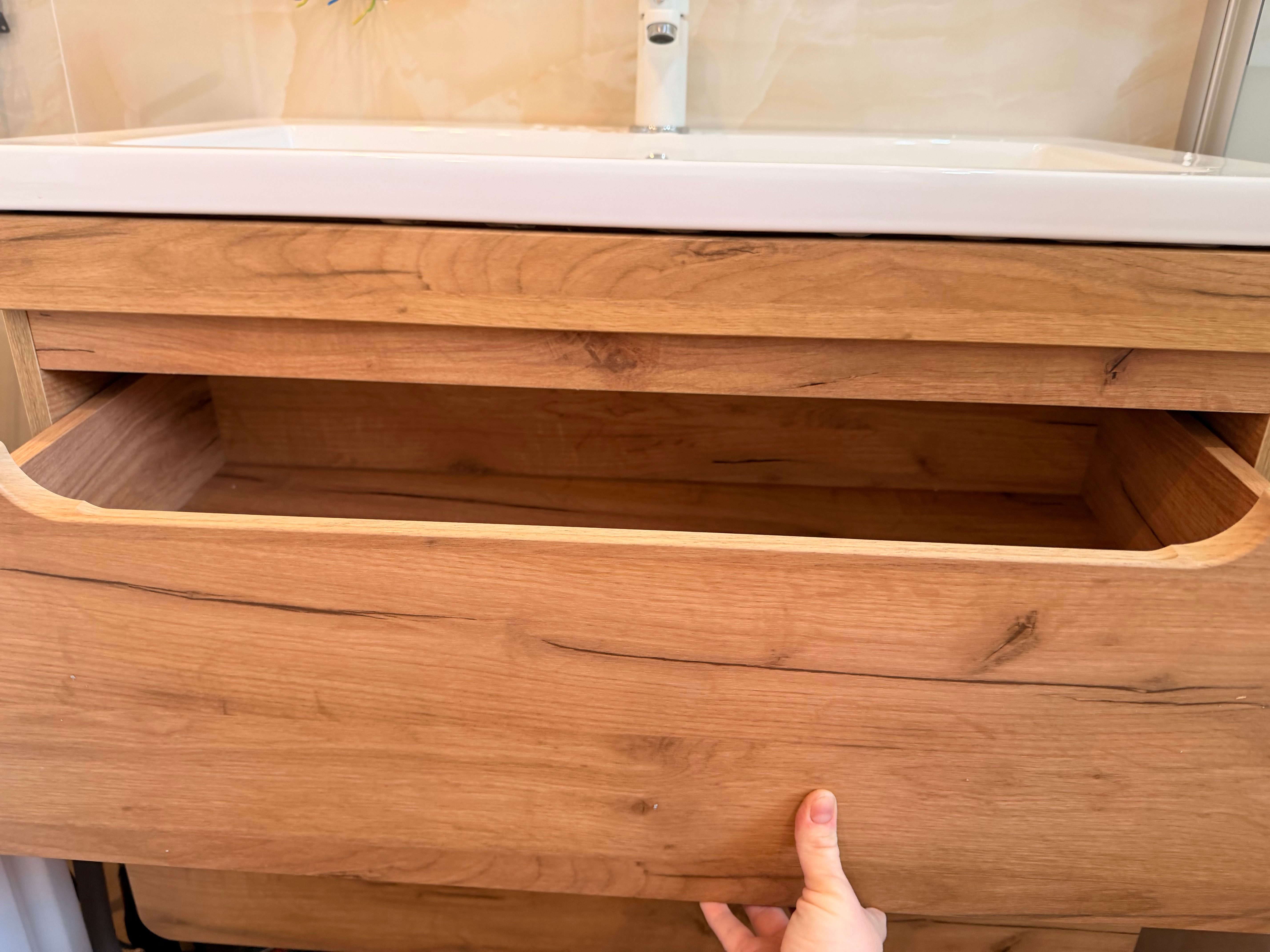 Die obere Schublade des Waschtischunterschranks ist nicht wie im Online-Katalog beschrieben ausgeschnitten. Nach der Montage stellt sich heraus, dass sie nicht korrekt nutzbar ist und das Gesamtbild stark beeinträchtigt wird.