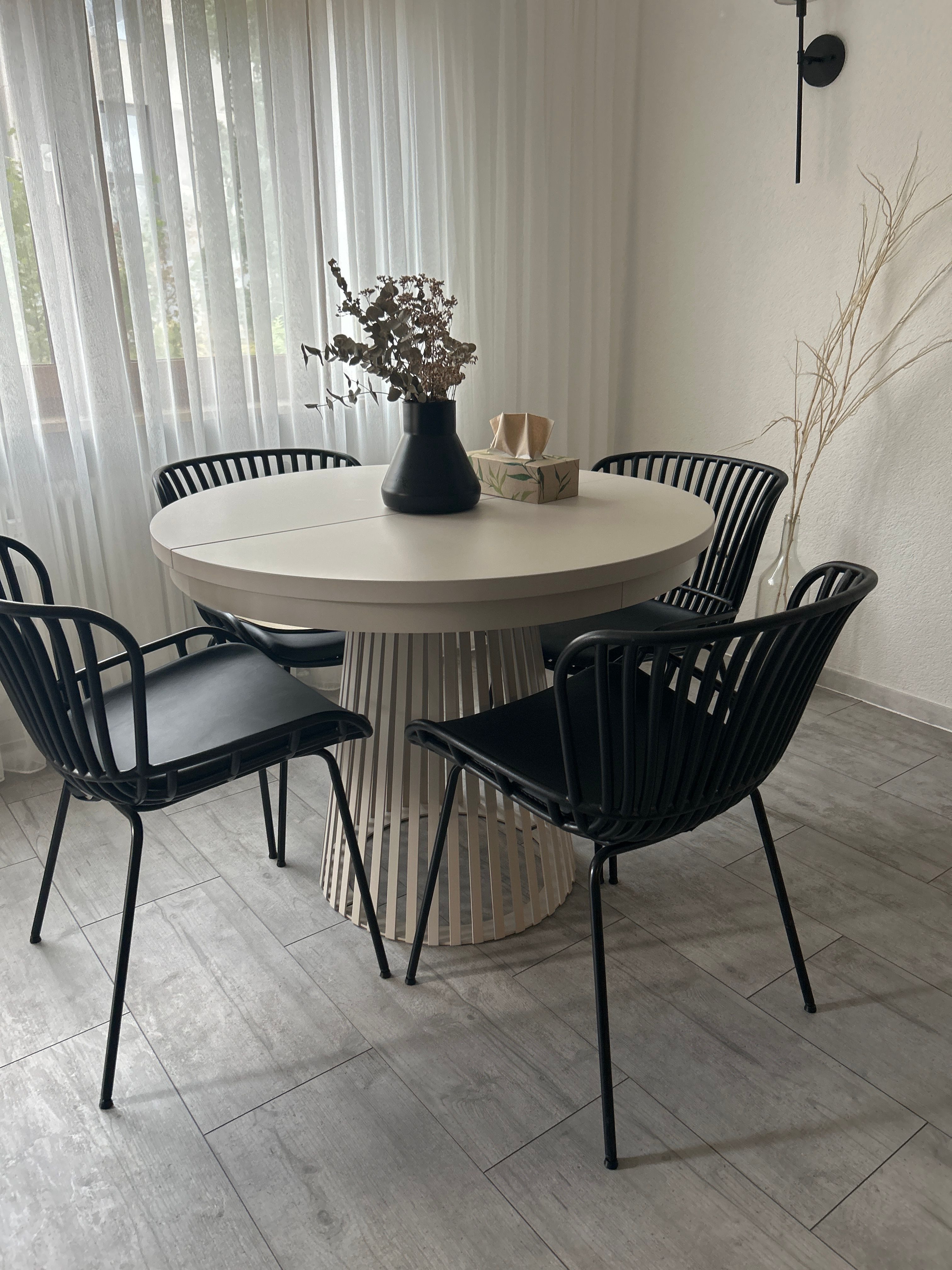 Um diese Probleme etwas zu verbessern, haben wir den Tisch mit dem zusätzlichen Einsatz geöffnet, sodass er oval und damit größer wird. Das war eigentlich nicht unser Plan, weil wir bewusst einen kleinen runden Tisch wollten, den wir nur bei Gästen erweitern. Durch das Öffnen haben wir zwar etwas mehr Platz gewonnen, aber es löst das Grundproblem nicht.