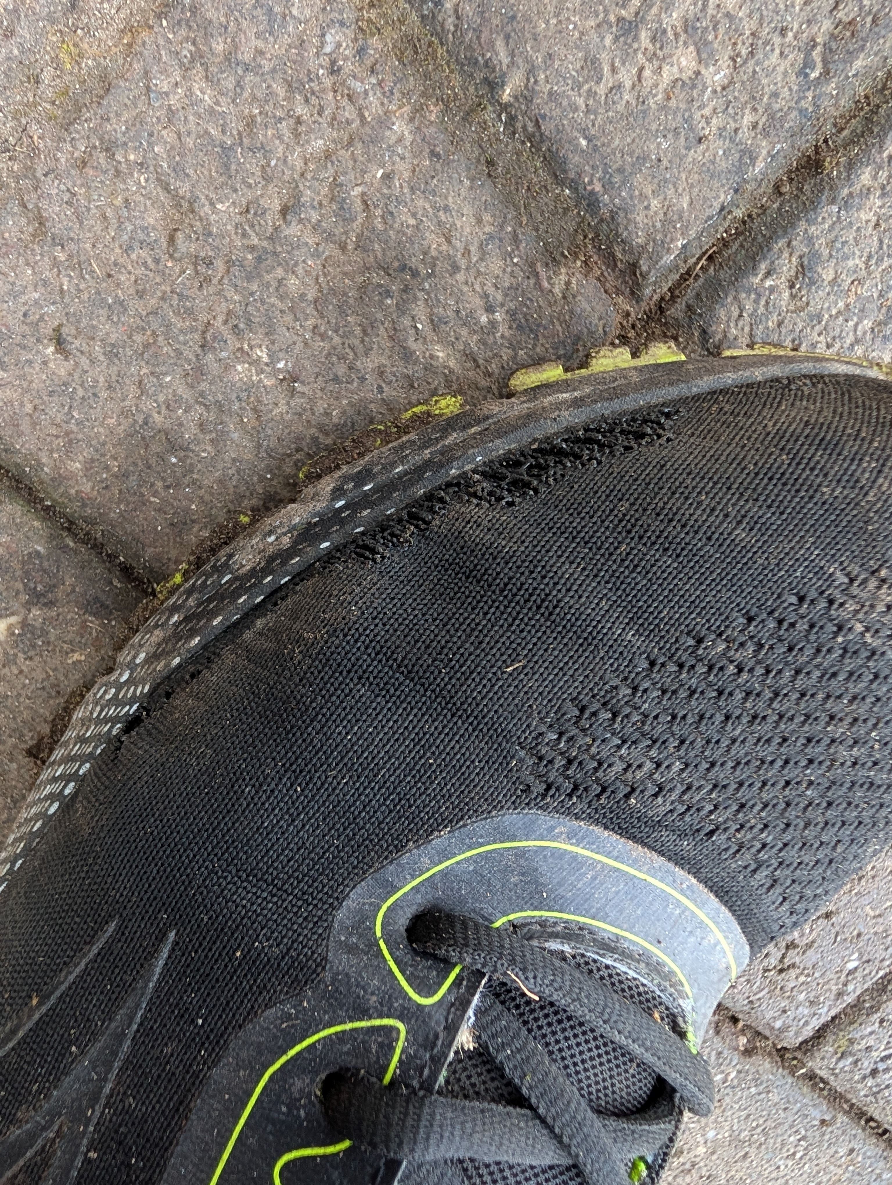 Der Schuh geht nach wenigen Tagen Nutzung schon auseinander am Übergang zwischen Sohle und oben.