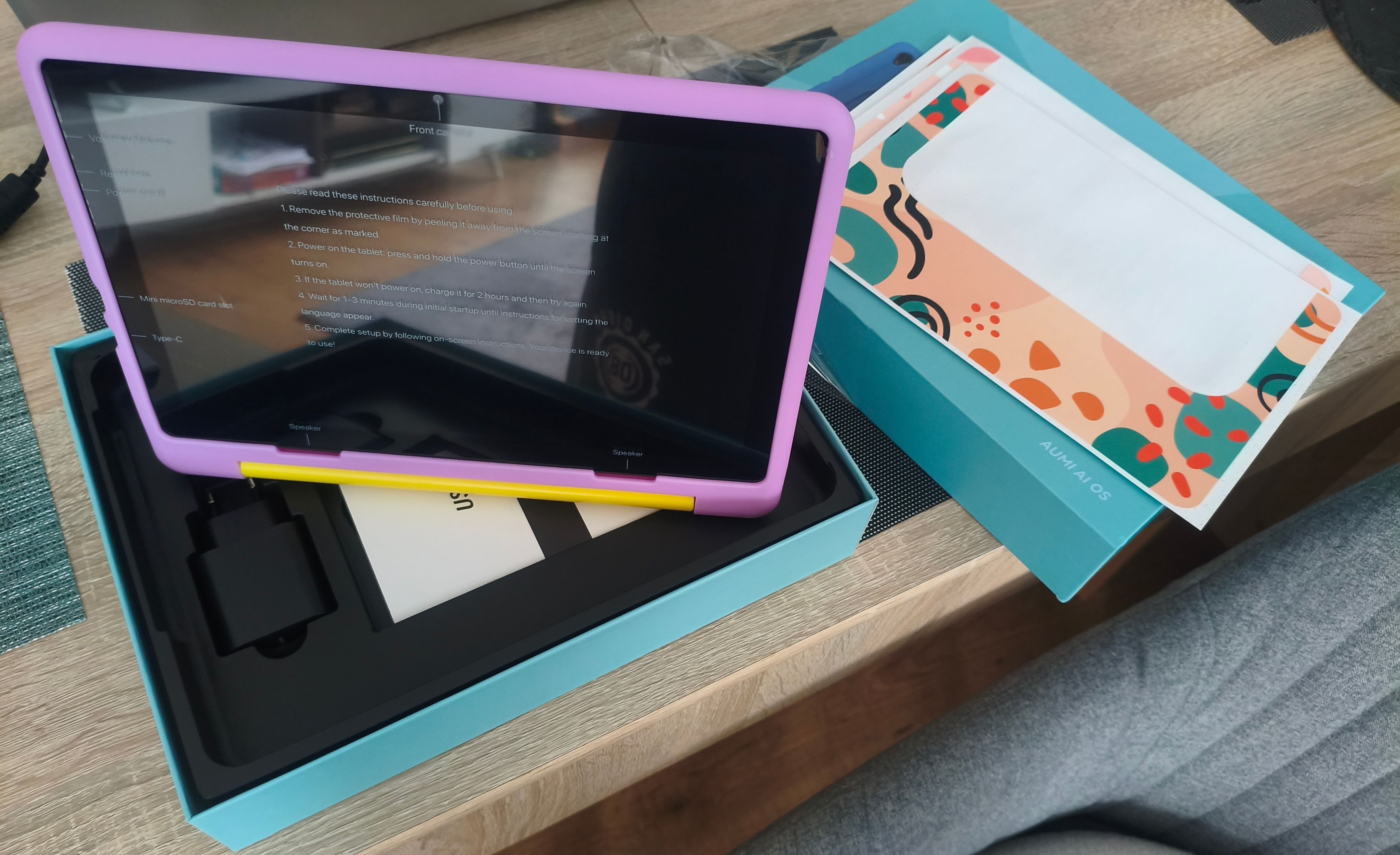 Das Tablet sieht optisch (lila) sehr schön aus und die Hülle ist auch perfekt für Kinder, da kann es gerne mal aus der Hand fallen, ohne, dass etwas passiert.