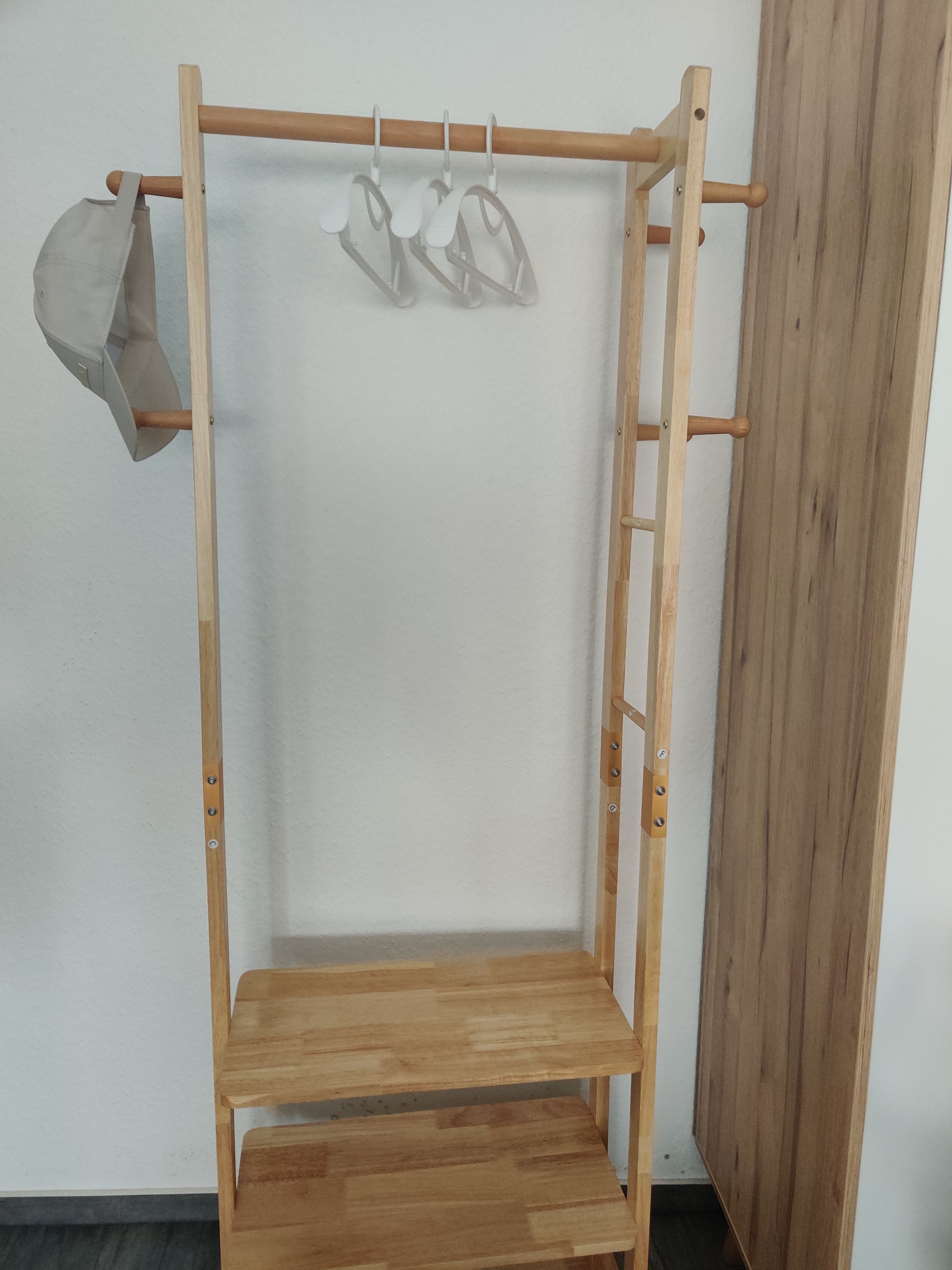 Die Haptik dieses Kleiderständers aus Holz ist wirklich angenehm – viel angenehmer als bei Metall. Mit einer Länge von 70 cm passt er perfekt ins Schlafzimmer und eignet sich ideal, um getragene, aber noch saubere Kleidung abzulegen.