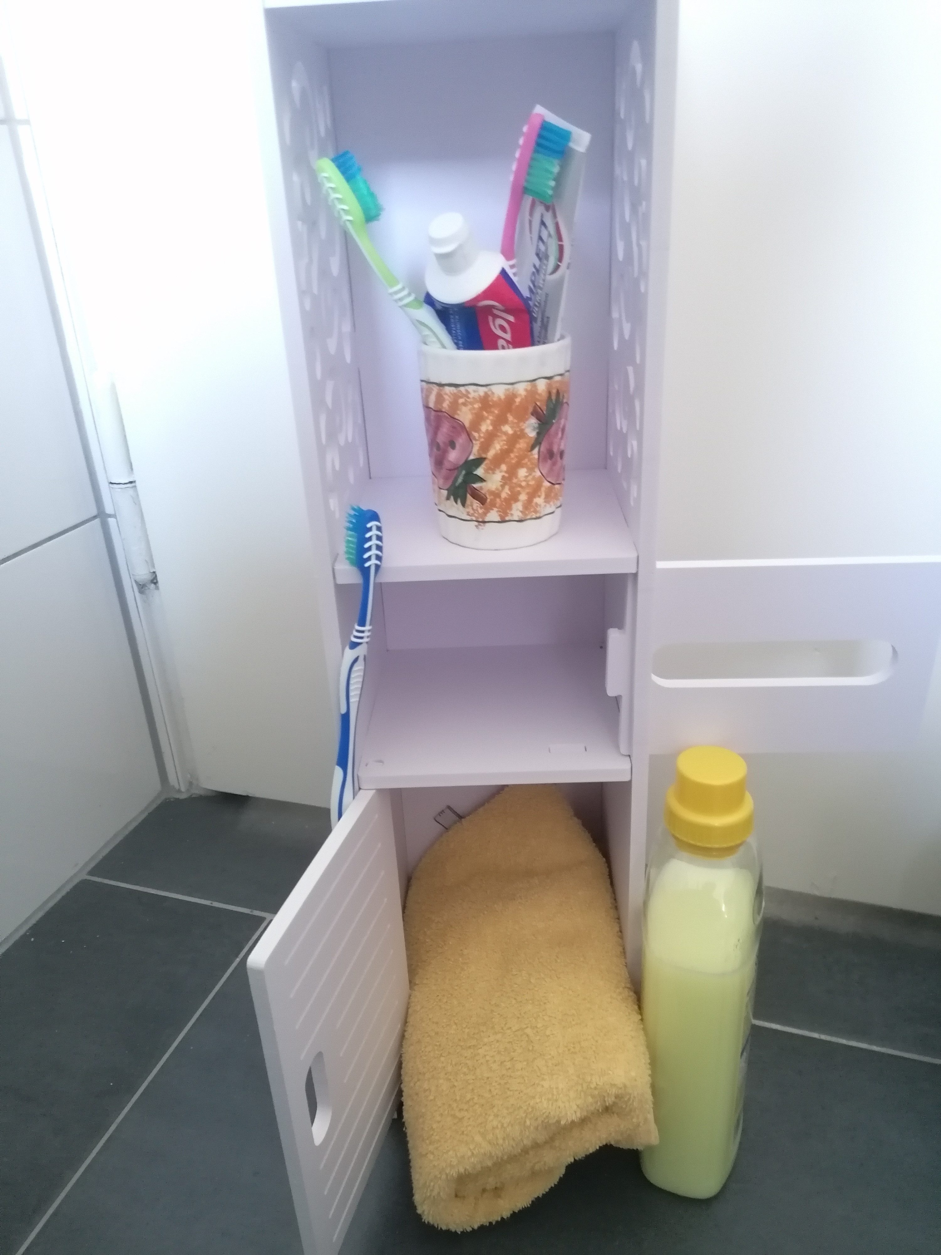 Das ist ein ziemlich unsinniges Produkt, ich empfehle es absolut nicht. Ich hatte es mir mit großer Begeisterung gekauft, aber nicht einmal Toilettenpapier passt in den Toilettenpapierhalter. Ich rate wirklich davon ab – kauft es nicht.