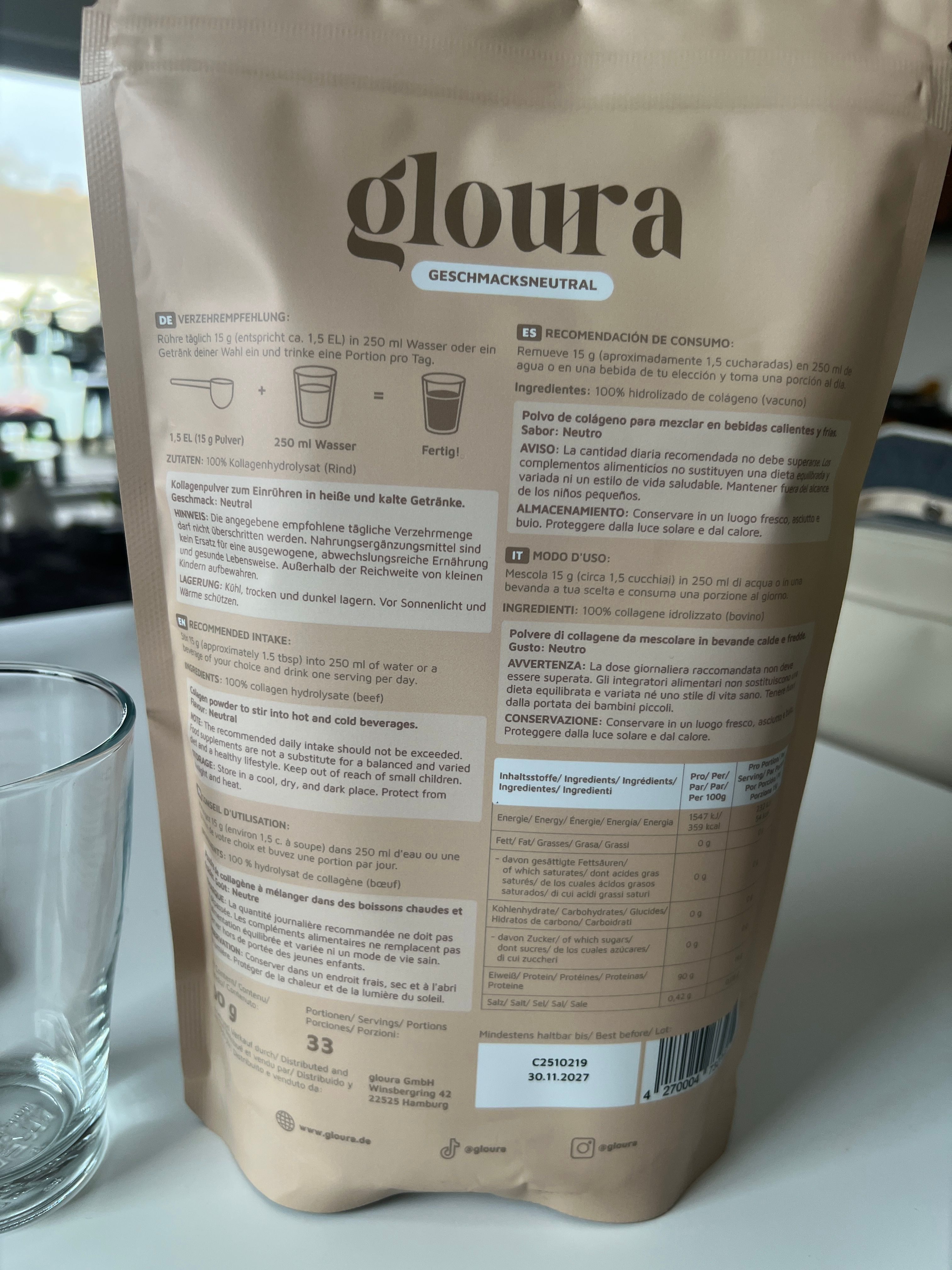 Das Gloura Kollagenpulver überzeugt mich durch die super Löslichkeit, ich hatte andere Kollagenpulver die sich nicht so toll aufgelöst haben.