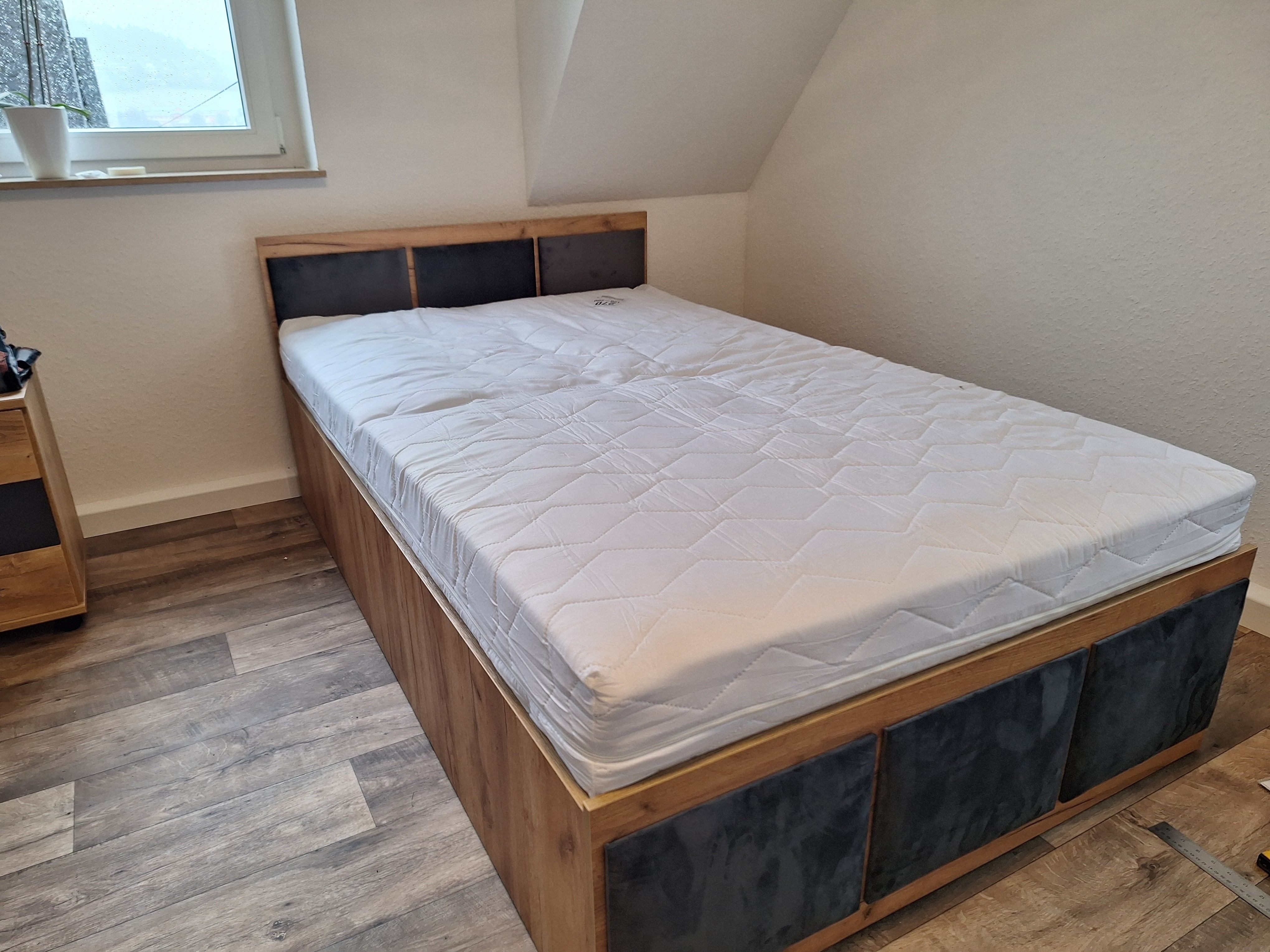 Wir sind überrascht wie toll das Bett aussieht. Wir haben es für unseren Sohn gekauft, da er durch den Bettkasten viel Stauraum in seinem neuen Zimmer gewonnen hat. Das Bett kam in einigen einzelnen Paketen. Der Aufbau wurde größtenteils von meinem Mann allein übernommen und dauerte ca. 4 Stunden. Er ist von der Verarbeitung und Qualität begeistert. Die Matratze in H2 kam sehr komprimiert an und hat sich innerhalb von 2 Tagen zur vollen Größe entfaltet und fühlt sich sehr angenehm an. Die Farbe "Holzeiche" passt perfekt zu den restlichen Möbeln in der Farbe "Plankeneiche". Qualitativ hochwertiger, als Möbel aus so manchen deutschen Möbelhäusern. 100 %ige Weiterempfehlung.