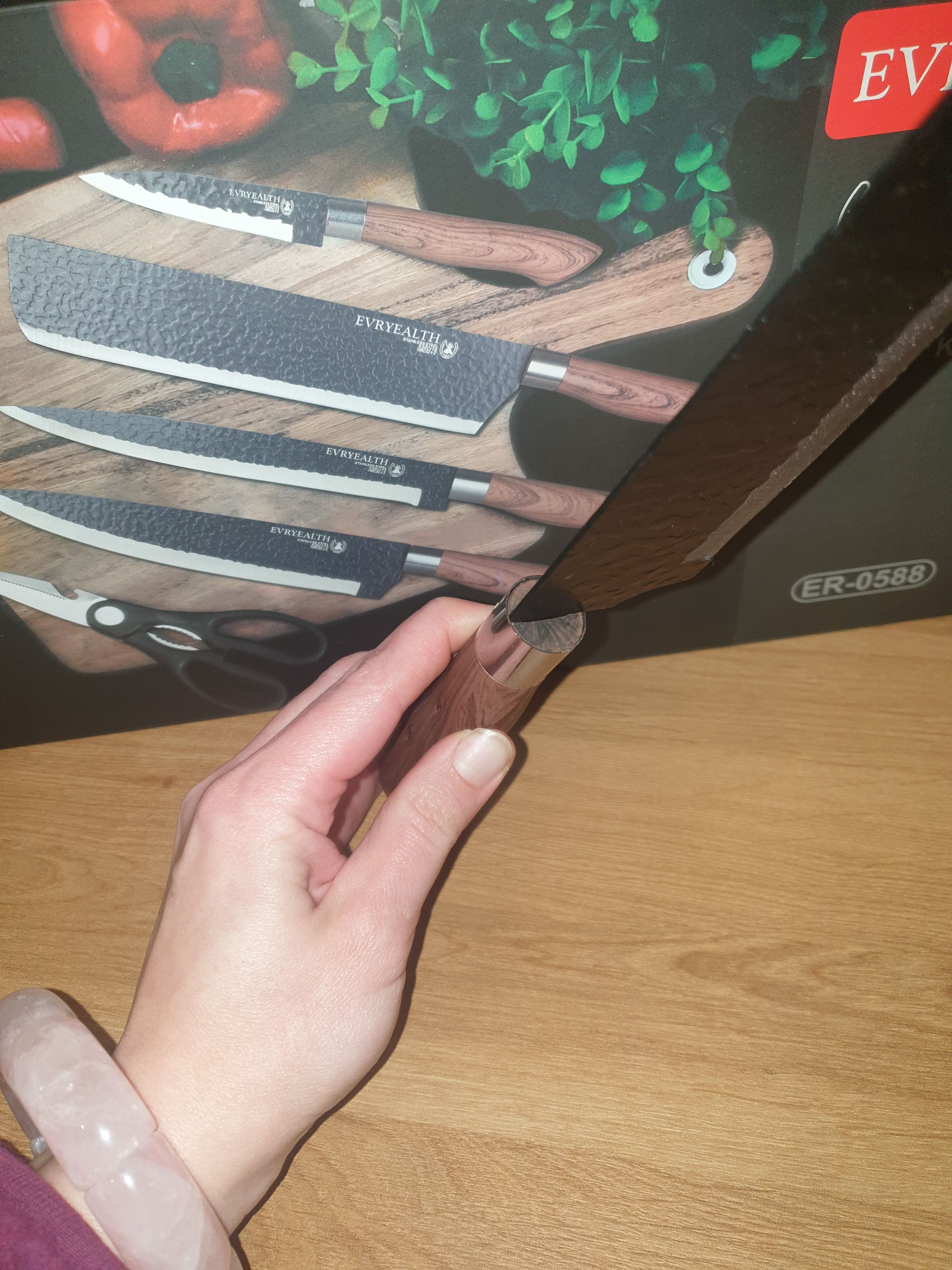 Es handelt sich nicht um Holzgriffe, sondern um Plastik. Die Klingen verbiegen sich so leicht, dass man nichtmal einen Apfel schneiden kann - da ist nichts "geschmiedet" oder "ausbalanciert".