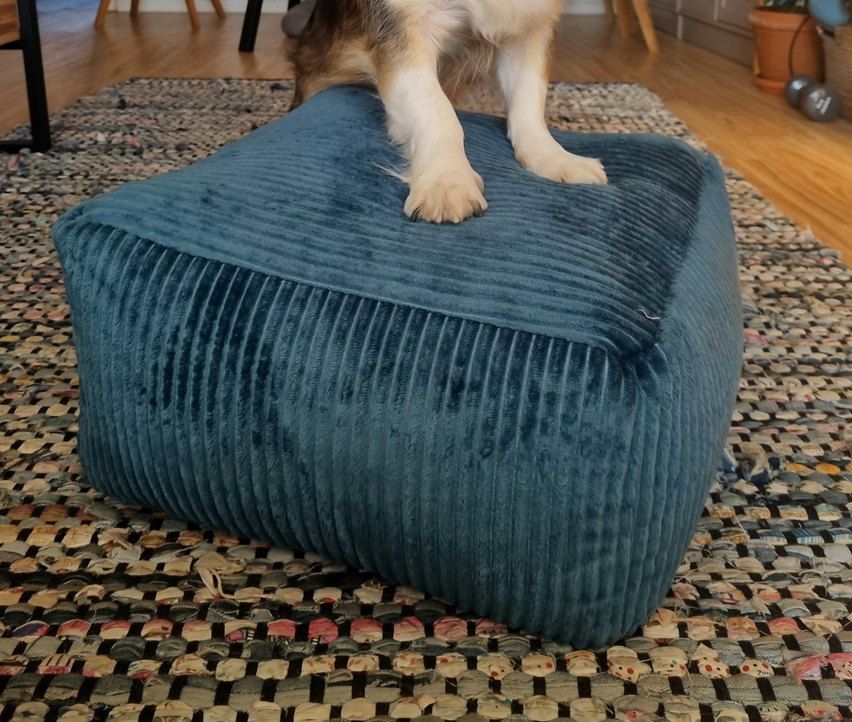 Wir haben den gleichen Pouf in Blaugrün bestellt und er passte perfekt in unser Wohnzimmer. Wir sind sehr zufrieden und unser Hund auch.