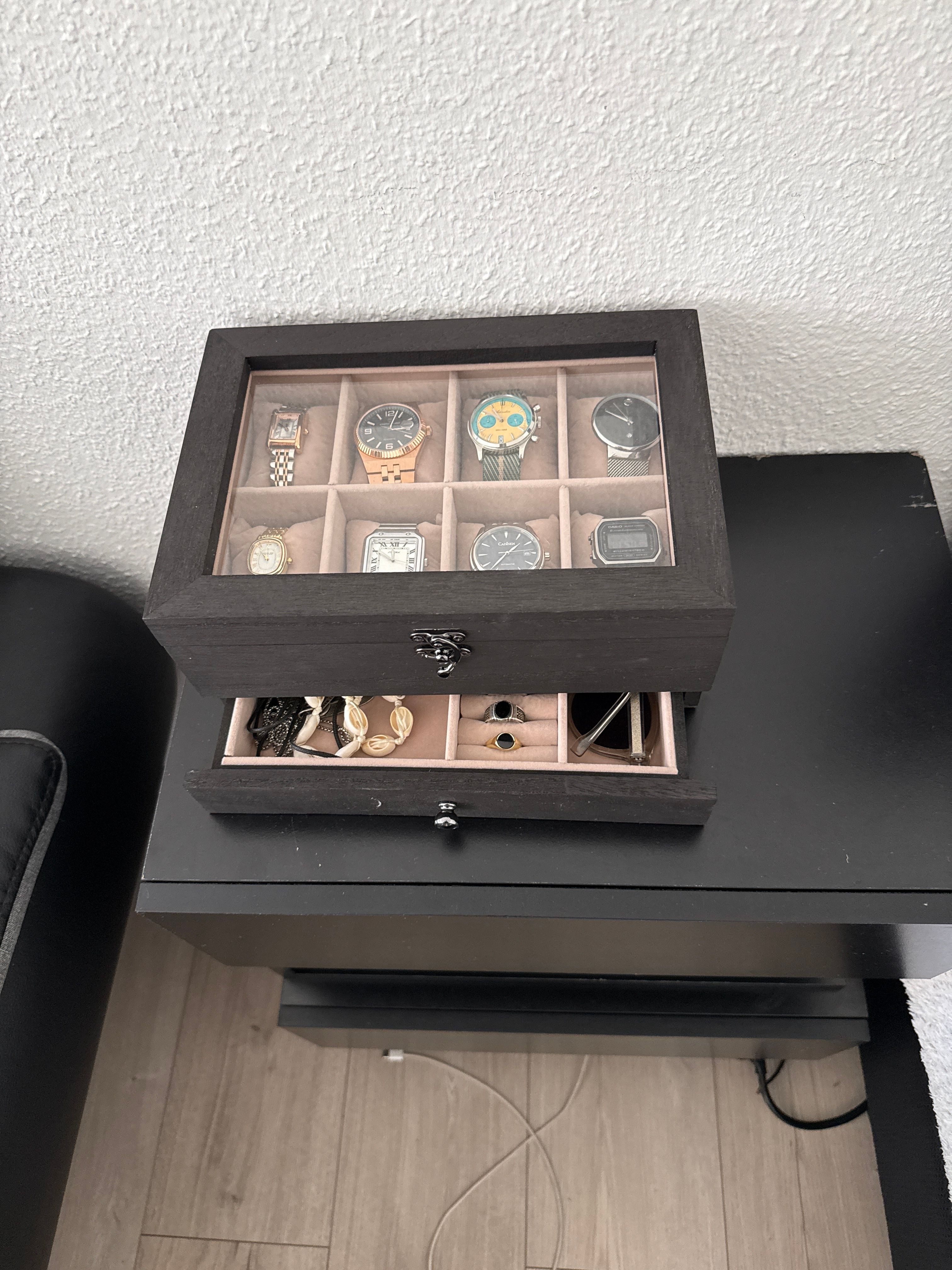 Qualität gut, alles in Ordnung. Preis super, Platz für mehrere Uhren, gefällt mir, auch für Ringe in der unteren Schublade.