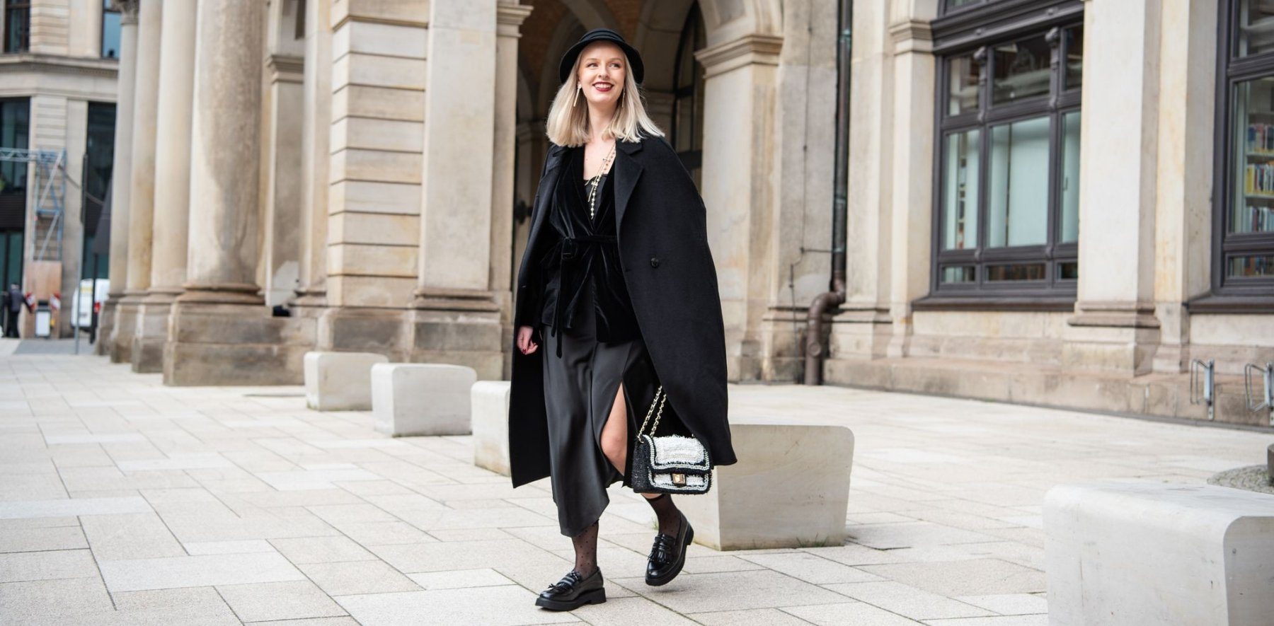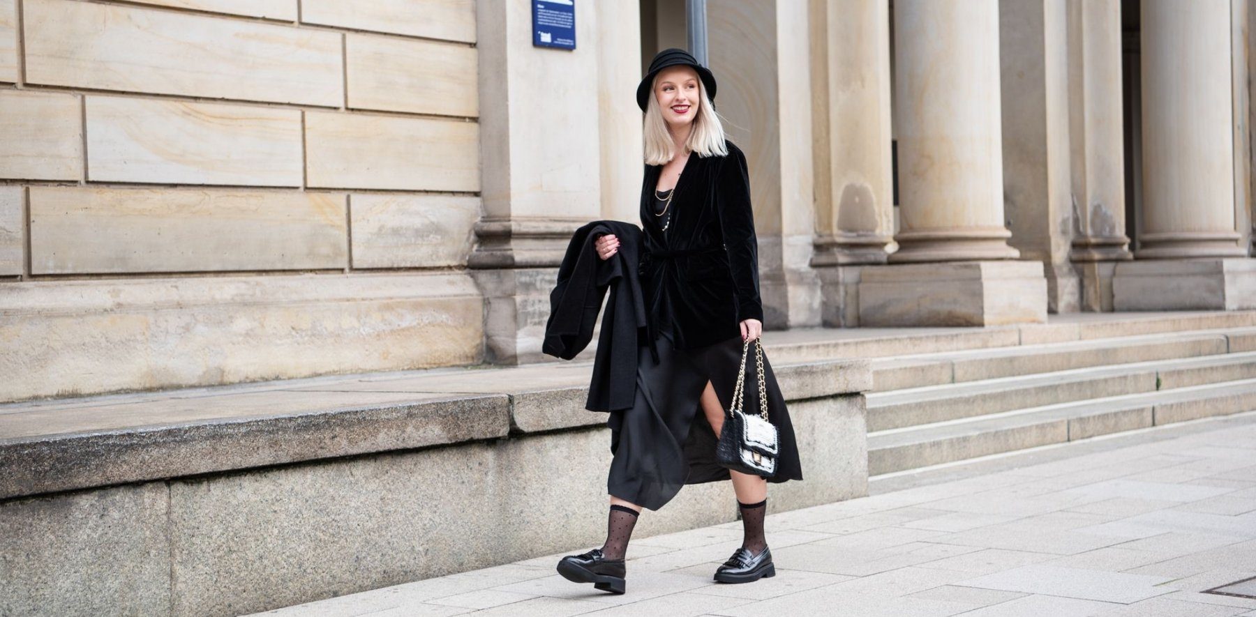 Ein seidig schimmerndes Slip Dress spiegelt die 20er-Jahre-Mode gut wider. Es ist elegant, dabei jedoch unkompliziert und engt nicht ein. Wähle ein schwarzes Satinkleid, das sich vielfältig kombinieren lässt. Für den Alltag kannst du Loafer zu deinem Charleston-Kleid tragen. Mit transparenten Socken holst du den Look ins Jahr 2021.