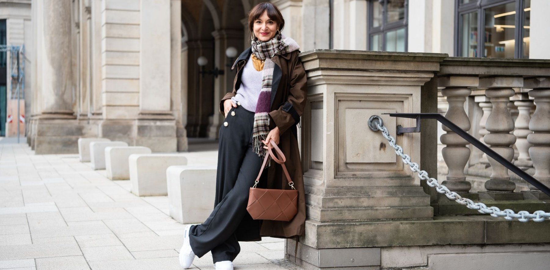 Greife für einen casual 20er-Jahre-Look mit Marlene-Hose zur senfgelben Bluse, über die du einen Strickpullunder in der Trendfarbe Flieder ziehst. Trage darüber einen Trenchcoat, der ebenso klassisch ist wie die weite Palazzo-Hose. Weiße Sneaker lassen dich bequem durch deinen Alltag kommen und machen den Look sportlicher.