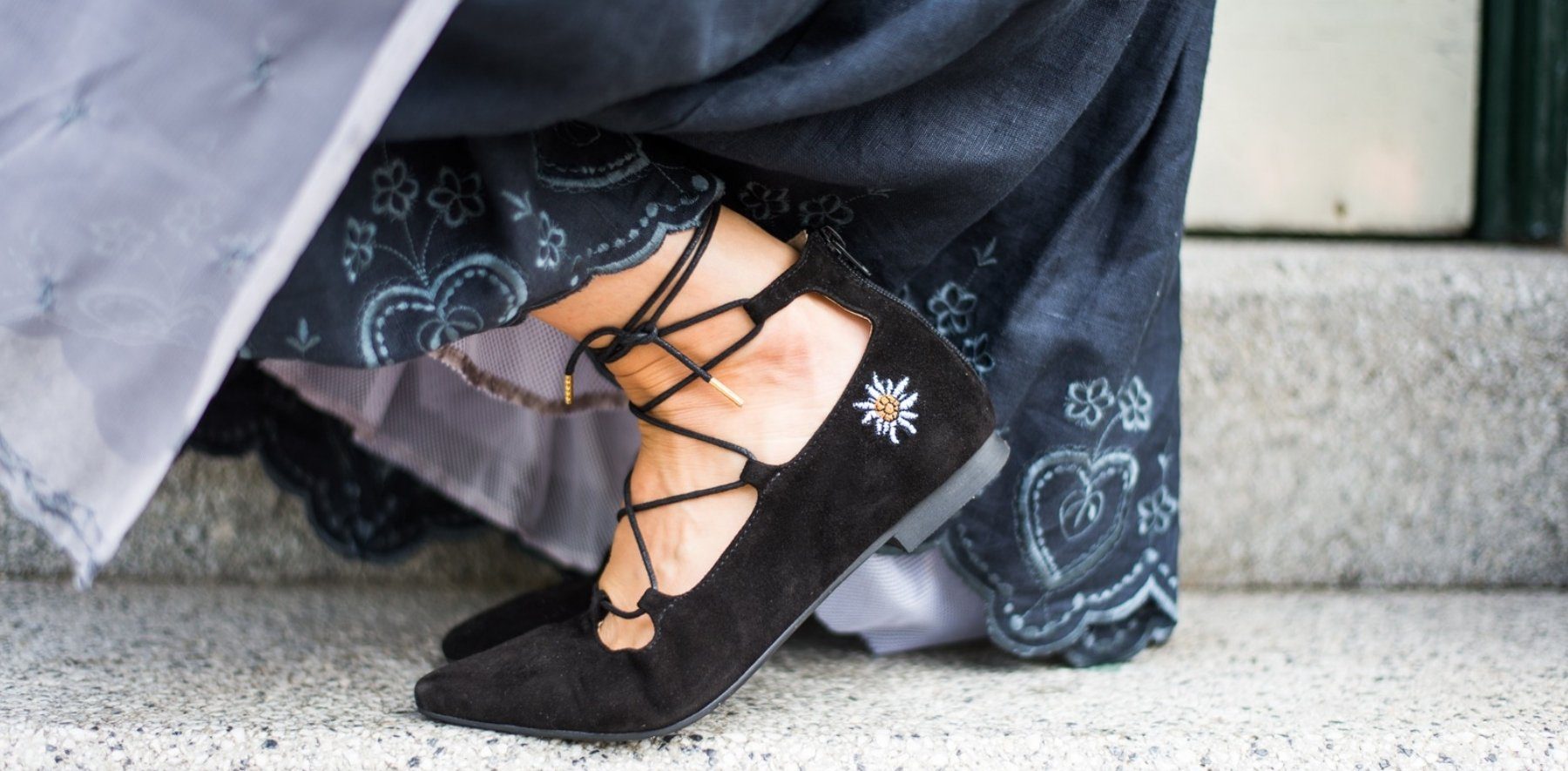 Die schwarzen Ballerinas bringen durch ihre Schnürung Aufregung in dein Dirndl-Outfit. Du kannst sie deiner eigenen Präferenz nach individuell schnüren und hast somit große Freiheit darin, wie du deinen Look wirken lassen möchtest. Tipp: Richte dich bei der Entscheidung nach der Länge deines Kleides oder Hose. Eine hohe Schnürung bietet sich ideal bei einer kürzen Länge an, da es deine Beine optisch verlängert.