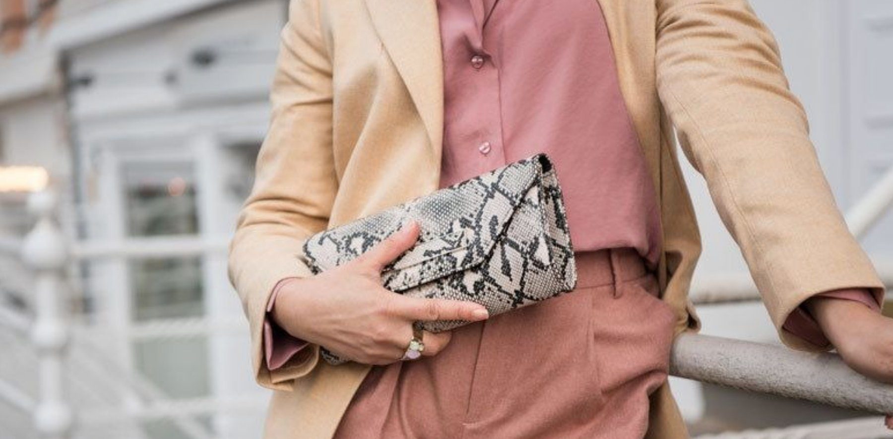 Damit der Pastell-Look nicht langweilig wird, wurde zu Accessoires im angesagten Animal Print gegriffen. Durch sie wird aus dem Outfit in zurückhaltenden Pastelltönen ein echter Power-Look. Während die Kleidungsstücke miteinander harmonieren, passen die Schuhe super zur Clutch im Snake-Skin-Muster. Dazu wird goldener Schmuck getragen, der perfekt zum Look in Altrosa passt.