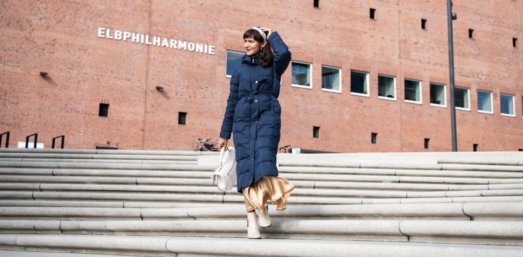 Mit dem Puffer Coat kannst du auch im Winter deine liebsten Kleider tragen. Von Kopf bis Wade hüllt dich der blaue Daunenmantel ein und wirkt trotz dickem Stoff elegant und zurückhaltend. Mit dem breiten Taillengürtel kommt deine Figur schön zur Geltung. Ein goldener Maxirock glänzt in den grauen Wintertagen und gibt deinem Outfit einen edlen Touch.