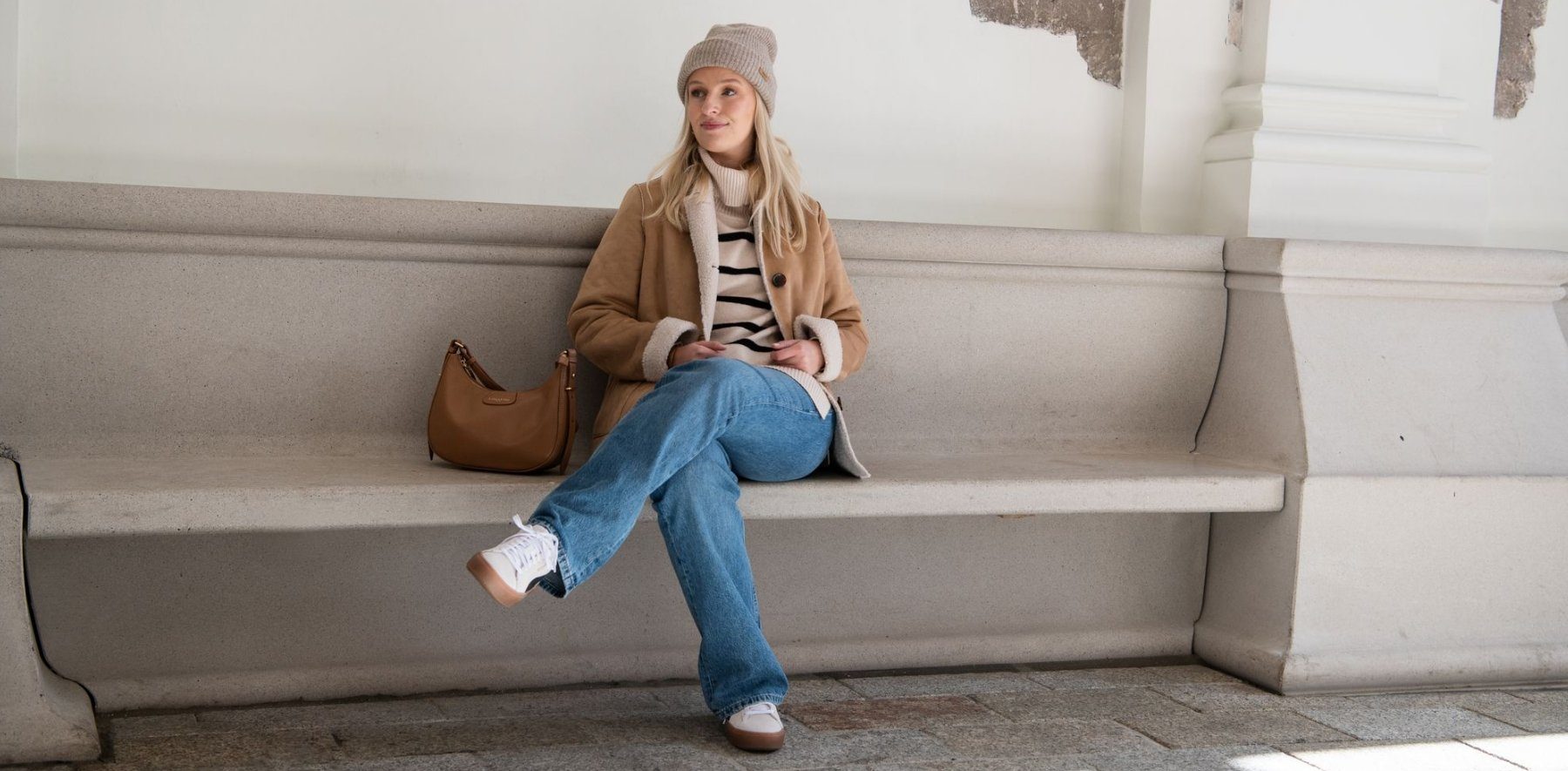 Style eine helle Jeans zu deinem Ringelpulli. Darüber passt eine kastig geschnittene Jacke im Shearlinglook. Das kuschelige Innenfutter greift die Farbe des Pullis ebenso auf wie die Mütze. Die hellbraune Ledertasche und Sneaker im Oldschool-Look machen dein Pullover-Outfit komplett.