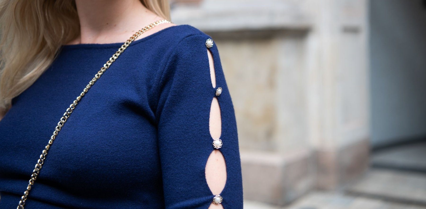 Bei dem dunkelblauen Pullover sind die Ärmel der Hingucker. Sie machen auch das schlichteste Outfit zu einem modischen Statement. Die Cut-Outs werden durch kleine Perlenknöpfe in Szene gesetzt. Neben Cut-Outs an den Ärmeln findest du bei diesem Pullovertrend auch Einblicke an Schultern, Rücken und Dekolleté.