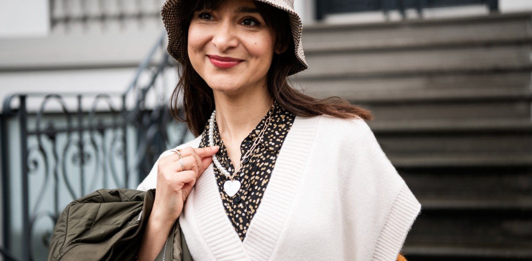 Für einen harmonischen Look sollte sich die Farbe deines Pullunders wie hier im Rest deines Outfits wiederfinden. Mit ausgewählten Accessoires kannst du jedoch Farbakzente setzen. Wähle zum Beispiel einen senfgelben Schal mit großen Fransen. Dazu passen die kleine braune Tasche und der olivgrüne Steppmantel. Ein Fischerhut bringt Coolness.