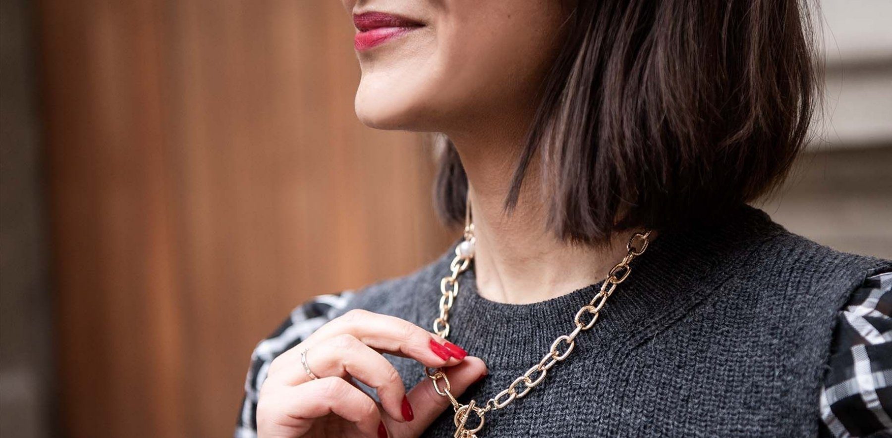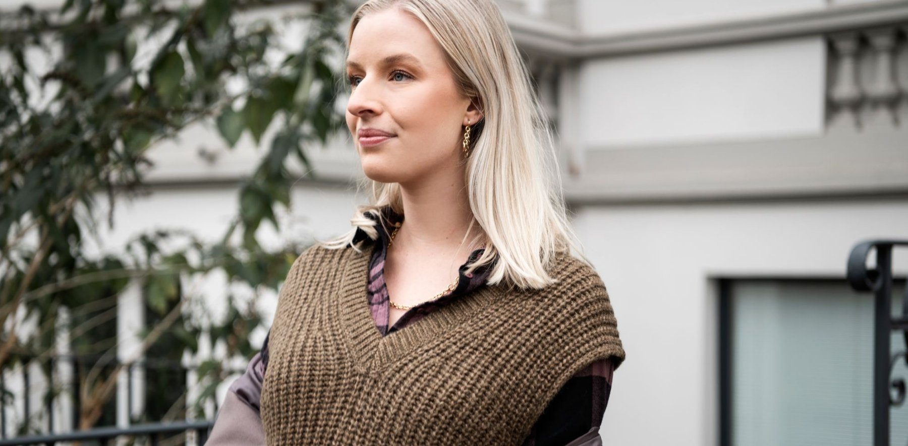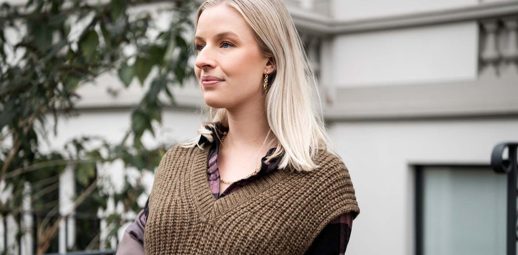 Für das gewisse Etwas sorgen eine schwarz-weiß karierte Bluse mit voluminösen Ärmeln und auffälliger Schmuck. Durch den schlichten Wollpullunder wirkt auch Modeschmuck sehr hochwertig. Tipp: Ein brauner Cardigan erhöht den Kuschelfaktor.