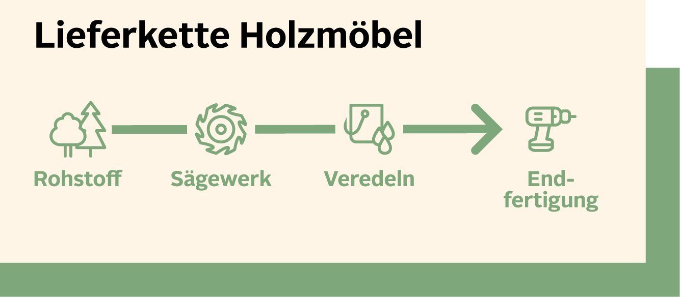 Der Weg eines Holzmöbels sieht dagegen ganz anders aus. Die Bäume werden gefällt, entlaubt und ins Sägewerk transportiert. Dort werden sie zunächst in Bretter zersägt, getrocknet und anschließend geschliffen. Danach wird das Holz ggf. veredelt, indem es lackiert, imprägniert oder beschichtet wird. In der sogenannten Endfertigung werden die Holzteile dann zu einem fertigen Möbelstück zusammengefügt.