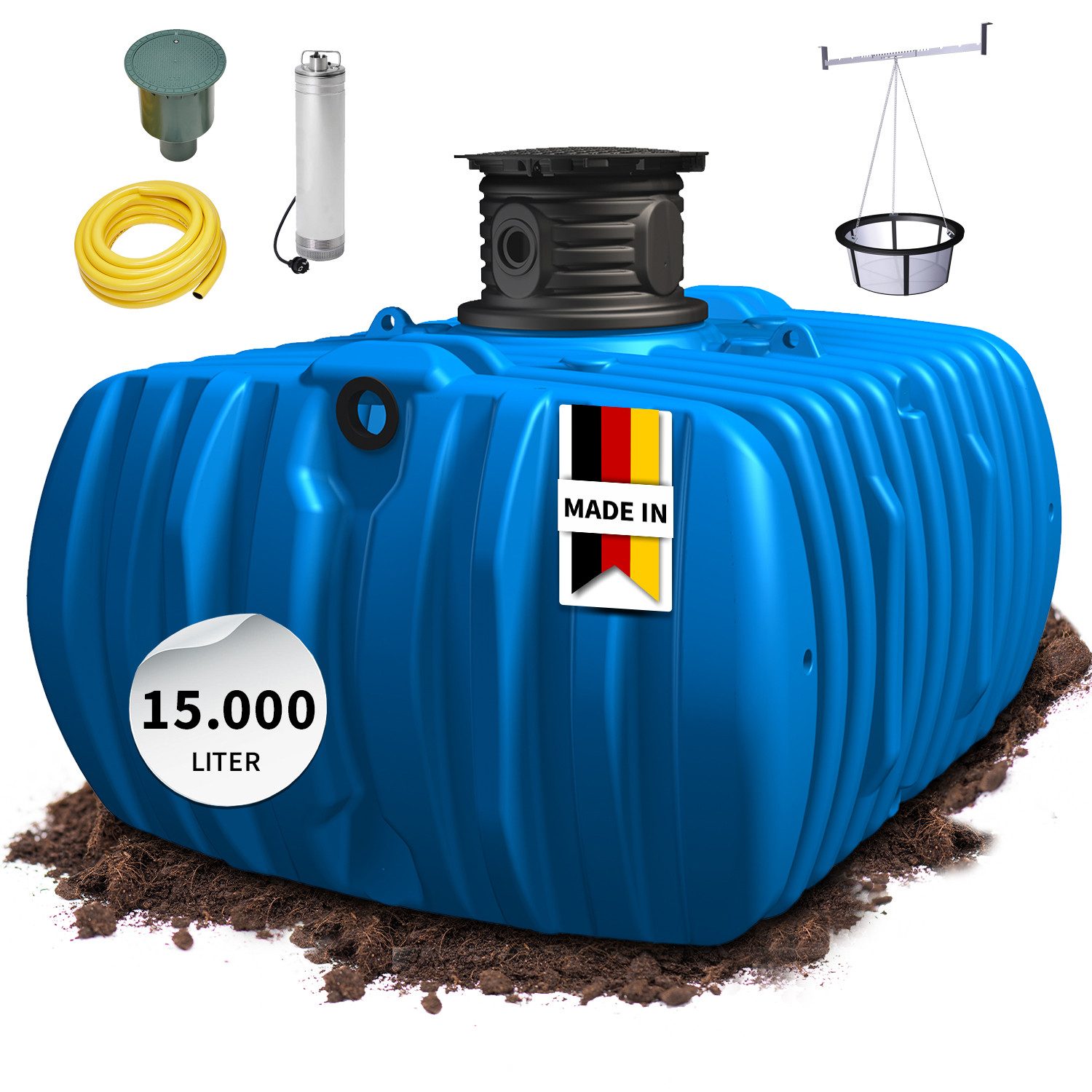 4rain FLAT Tanksystem Komplettpaket Garten-Comfort - Der perfekte Do-it-yourself Tank. Passt nicht - gibt´s nicht! Das FLAT L Flachtank-Set hat ein Gesamtvolumen von 15.000 Litern (bestehend aus drei FLAT L Tankmodulen á 5.000 Liter), durch ein bewährtes Steck-Verbindungssystem ist der Tank flexibel erweiterbar und Sie können ein beliebig großes Speichervolumen erreichen. Der Flachtank wird einbaufertig inkl. Tankdomsystem für den frostsicheren Einbau und begehbarer Tankabdeckung geliefert. Die flache Bauweise des Tanks sorgt für einen geringen Erdaushub in Ihrem Garten und somit einen kostengünstigen Einbau. Das geringe Gewicht von ca. 240 kg je Tankmodul und die am Tank integrierten Kranösen ermöglichen ein leichtes Handling bis in die Baugrube. Die anschlussfertigen, vormontierten Lippendichtungen dienen zur schnellen und sicheren Installation der Anschlüsse. Die kürzbare Schachtverlängerung (kürzbar von 460 bis 760 mm) ermöglicht Ihnen eine einfache Anpassung an die Geländeoberkante, zudem ist der Domschacht 360 Grad drehbar und sorgt daher für eine variable Montage. Der im Lieferumfang enthaltene schwarze, robuste Kunststoffdeckel lässt sich kindersicher verschließen. Die kurzfristige Belastung der begehbaren Tankabdeckung beträgt max. 150 kg, die langfristige Flächenbelastung liegt bei max. 50 kg. Zu Ihrer Sicherheit ist das FLAT Tanksystem zusätzlich gegen das Eindringen von Sickerwasser geschützt. Somit steht der Möglichkeit kostenloses Regenwasser zu sammeln und Ihren Garten nachhaltig zu bewässern, ab sofort nichts mehr im Weg. Wenn Sie sich für ein 4rain Produkt entscheiden, entscheiden Sie sich für Nachhaltigkeit. Dieser Regenwassertank wird unter Einsatz von Recyclingkunststoff hergestellt und ist zu 100 % recycelbar. Das Komplettpaket "Garten-Comfort" ermöglicht Ihnen Wasser zu zapfen wie Strom aus der Steckdose. Durch die Edelstahl Tauchdruckpumpe mit integrierter Pumpensteuerung erreichen Sie höchsten Bedienungskomfort (Pumpe schaltet sich automatisch ein und aus). Die Pumpe verfügt über die folgenden technischen Details, Motorleistung 0,85 kW, max. Förderhöhe 32 m, max. Druck 3,2 bar, max. Fördermenge 5.100 l/h. Der mitgelieferte Filterkorb zum Einhängen in den Tankdom, filtert einfach und zuverlässig Verschmutzungen aus dem Regenwasser und hat eine Wasserausbeute von 100 %. Die externe Wassersteckdose mit integriertem 2-Wege-Ventil für handelsübliche Schlauchkupplungen, macht die Wasserentnahme denkbar einfach und komfortabel. Qualität Made in Germany. 15 Jahre Herstellergarantie bestätigen den hohen Qualitätsanspruch dieses Produktes. Abmessungen Einzeltank: 245 x 210 x 134 cm (L x B x H) / Höhe inkl. Domschacht max. 210 cm.