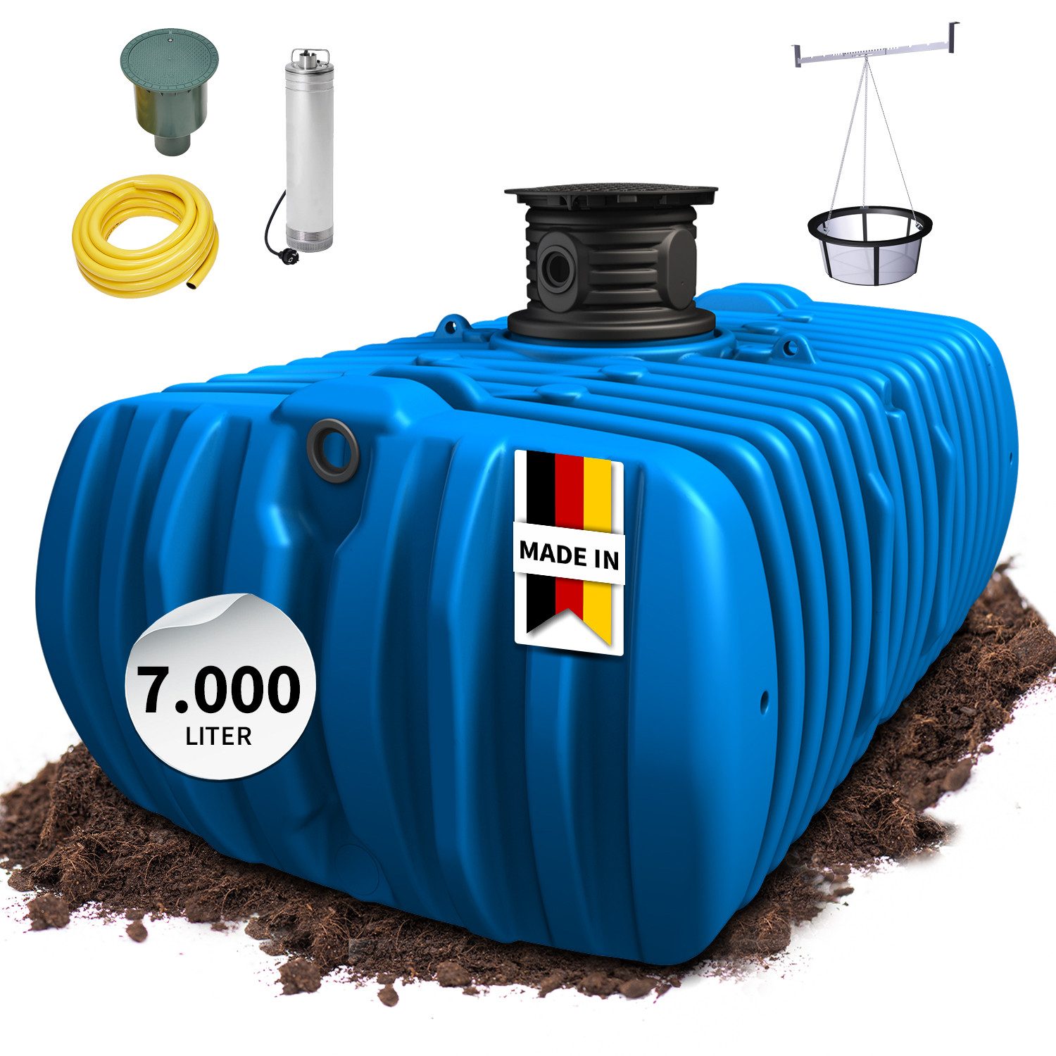 4rain FLAT Tanksystem Komplettpaket Garten-Comfort - Der perfekte Do-it-yourself Tank. Passt nicht - gibt´s nicht! Der FLAT XL Flachtank hat ein Gesamtvolumen von 7.000 Litern, durch ein bewährtes Steck-Verbindungssystem ist der Tank flexibel erweiterbar und Sie können ein beliebig großes Speichervolumen erreichen. Der Flachtank wird einbaufertig inkl. Tankdomsystem für den frostsicheren Einbau und begehbarer Tankabdeckung geliefert. Die flache Bauweise des Tanks sorgt für einen geringen Erdaushub in Ihrem Garten und somit einen kostengünstigen Einbau. Das geringe Gewicht und die am Tank integrierten Kranösen ermöglichen ein leichtes Handling bis in die Baugrube. Die anschlussfertigen, vormontierten Lippendichtungen dienen zur schnellen und sicheren Installation der Anschlüsse. Die kürzbare Schachtverlängerung (kürzbar von 460 bis 760 mm) ermöglicht Ihnen eine einfache Anpassung an die Geländeoberkante, zudem ist der Domschacht 360 Grad drehbar und sorgt somit für eine variable Montage. Der im Lieferumfang enthaltene schwarze, robuste Kunststoffdeckel lässt sich kindersicher verschließen. Die kurzfristige Belastung der begehbaren Tankabdeckung beträgt max. 150 kg, die langfristige Flächenbelastung liegt bei max. 50 kg. Zu Ihrer Sicherheit ist das FLAT Tanksystem zusätzlich gegen das Eindringen von Sickerwasser geschützt. Somit steht der Möglichkeit kostenloses Regenwasser zu sammeln und Ihren Garten nachhaltig zu bewässern, ab sofort nichts mehr im Weg. Wenn Sie sich für ein 4rain Produkt entscheiden, entscheiden Sie sich für Nachhaltigkeit. Dieser Regenwassertank wird unter Einsatz von Recyclingkunststoff hergestellt und ist zu 100 % recycelbar. Qualität Made in Germany. 15 Jahre Herstellergarantie bestätigen den hohen Qualitätsanspruch dieses Produktes. Das Komplettpaket "Garten-Comfort" ermöglicht Ihnen Wasser zu zapfen wie Strom aus der Steckdose. Durch die Edelstahl Tauchdruckpumpe mit integrierter Pumpensteuerung erreichen Sie höchsten Bedienungskomfort (Pumpe schaltet sich automatisch ein und aus). Die Pumpe verfügt über die folgenden technischen Details, Motorleistung 0,85 kW, max. Förderhöhe 32 m, max. Druck 3,2 bar, max. Fördermenge 5.100 l/h. Der mitgelieferte Filterkorb zum Einhängen in den Tankdom, filtert einfach und zuverlässig Verschmutzungen aus dem Regenwasser und hat eine Wasserausbeute von 100 %. Die externe Wassersteckdose mit integriertem 2-Wege-Ventil für handelsübliche Schlauchkupplungen, macht die Wasserentnahme denkbar einfach und komfortabel.