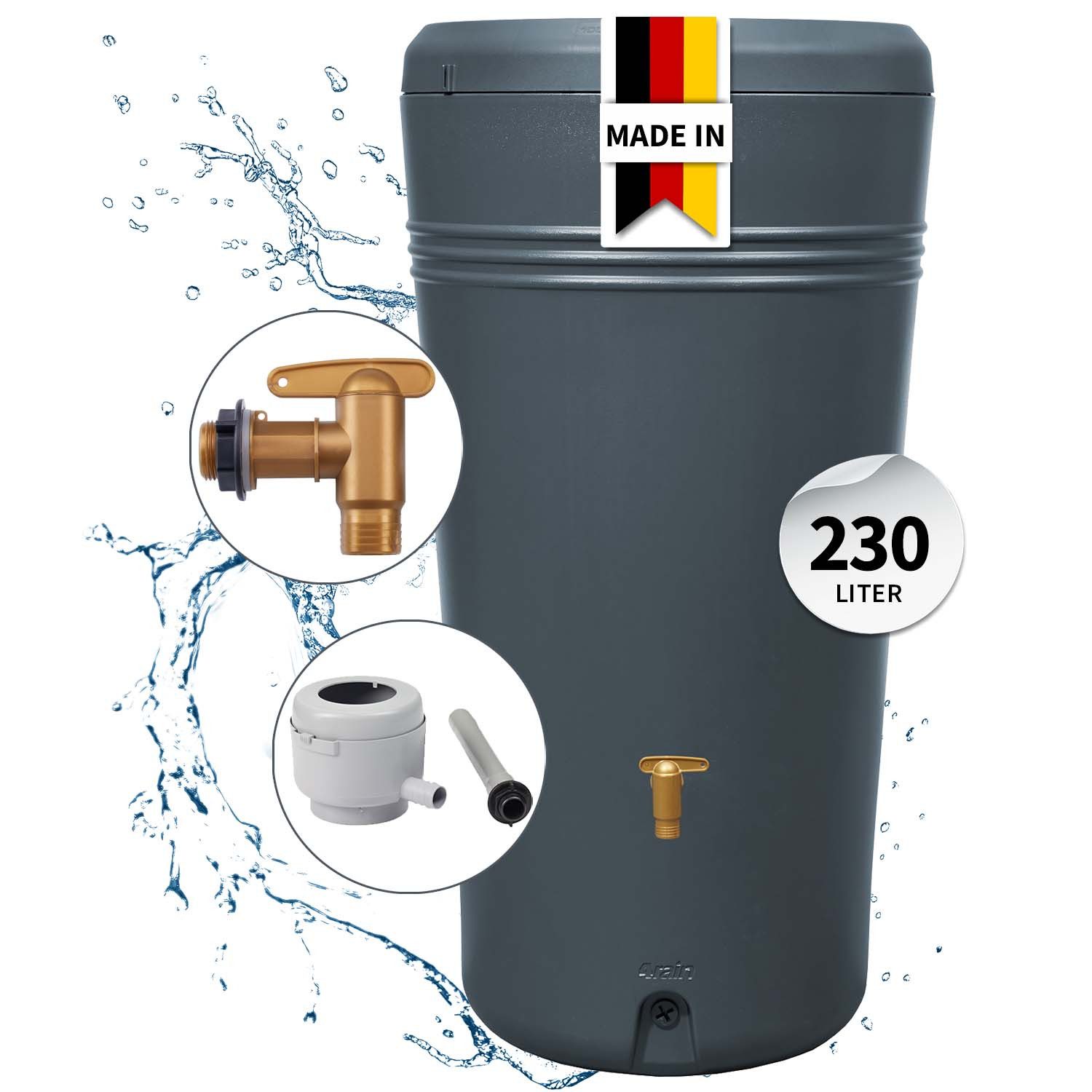 4rain Azura 2in1 Regenspeicher graphite grey - das anschlussfertige Komplett-Set inkl. Auslaufhahn und Fallrohrfilter! Diese Regentonne überzeugt in Ihrem Garten durch ihr schlichtes Design und ihre moderne Farbgebung in anthrazit. Die kompakten Abmessungen lassen den Regenspeicher elegant und dekorativ in Ihre Gartengestaltung einfließen. Entscheiden Sie sich für eine Nachhaltige Gartenbewässerung, schonen Sie wertvolle Ressourcen und vor allem Ihren Geldbeutel. Sammeln Sie ab sofort Regenwasser, das ohnehin kostenlos vom Himmel fällt. Der Behälter bietet Ihnen hierfür ein Speichervolumen von 230 Litern. Zudem bietet er neben der Möglichkeit kostenloses Regenwasser zu sammeln, auch die Möglichkeit einer dekorativen Bepflanzung. Eine robuste, herausnehmbare Pflanzschale mit einer Tiefe von 18 Zentimetern ist im Lieferumfang enthalten. Die Pflanzschale verfügt außerdem über eine integrierte Befestigungsmöglichkeit für einen zusätzlichen Entnahmeschlauch (optionales Zubehör). Der Regenspeicher ist mit zwei integrierten Gewindeanschlüssen 19 mm (3/4'') für die Montage des mitgelieferten Auslaufhahns, sowie zur Restentleerung vor der Frostperiode ausgestattet. Besonders robust und langlebig - witterungsbeständige Materialien mit hohem UV-Schutz sorgen für eine lange Lebensdauer beim Einsatz im Freien. Bereits bei der Entwicklung eines 4rain Produkts wird sehr viel Wert auf ein nachhaltiges Produktdesign gelegt. Dieser Regenwasserbehälter wird aus Recyclingkunststoff hergestellt und ist zu 100 % recycelbar. Qualität "Made in Germany". Der im Lieferumfang enthaltene Fallrohranschluss filtert zuverlässig Verschmutzungen aus dem Regenwasser, füllt den Regenspeicher automatisch und verhindert ein Überlaufen des vollen Tanks. Schlanke Bauform - nur 16 mm Abstand zwischen Fallrohr und Hauswand werden benötigt. Einfache Umstellung von Sommer- auf Winterbetrieb. Geeignet für Fallrohre mit einem Durchmesser von 70-100 mm (DN 70-100). Max. empfohlene Dachfläche 50 m². Regentonnenanschluss 25 mm (1''). Hinweis: Behälter muss bei Frostgefahr im Winter vollständig entleert werden.