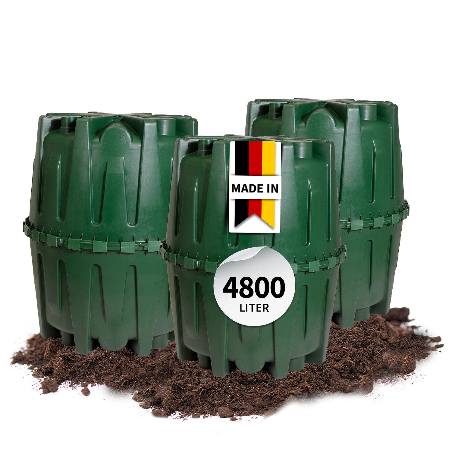 4rain Herkules Tanksystem - Der flexible Preishammer. Der Herkules Regenwassertank hat ein Gesamtvolumen von 4.800 Litern, bestehend aus drei Tanks á 1.600 Liter, welche zur Verbindung bereits vorgebohrt sind. Durch die angeformten Stutzen und die Anschlussflächen ist der Tank flexibel erweiterbar und Sie können ein beliebig großes Speichervolumen erreichen. Zudem ist das Tanksystem dreifach einsetzbar! Zur oberirdischen Aufstellung in Ihrem Garten, zum unterirdischen Einbau oder als Kellertank (die Tankhälften passen durch jede Normtür ab 80 cm). Durch seine geringe Grundfläche von nur 2 m² für 1.600 Liter ist der Tank extrem platzsparend und das geringe Gewicht von ca. 30 kg je Tankhälfte ermöglicht einen bequemen Transport und ein leichtes Handling. Somit steht der Möglichkeit kostenloses Regenwasser zu sammeln und Ihren Garten nachhaltig zu bewässern, ab sofort nichts mehr im Weg. Das Herkules Tanksystem besteht aus jeweils zwei Halbschalen und wird durch montagefreundliche Schnellverbinder innerhalb weniger Minuten montiert. Durch die solide Profildichtung ist der Tank dauerhaft dicht, die Haltbarkeit der Dichtung von über 25 Jahren ist nachgewiesen. Nachhaltige Produkte - das Behältermaterial ist zu 100 % recycelbar. Qualität Made in Germany. 10 Jahre Herstellergarantie bestätigen den hohen Qualitätsanspruch dieses Produktes.