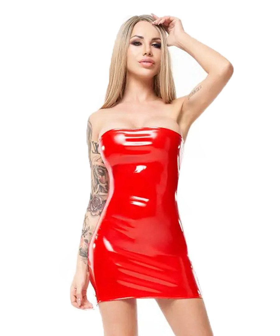 Rotes knappes Damen Dessous fetisch Minikleid, gefertigt aus dehnbarem Lack-Material, mit seitlichem Reißverschluss. Farbe : rotMaterial : 60% Polyester / 40% Polyurethanerhältliche Größen : S, M, L, XL