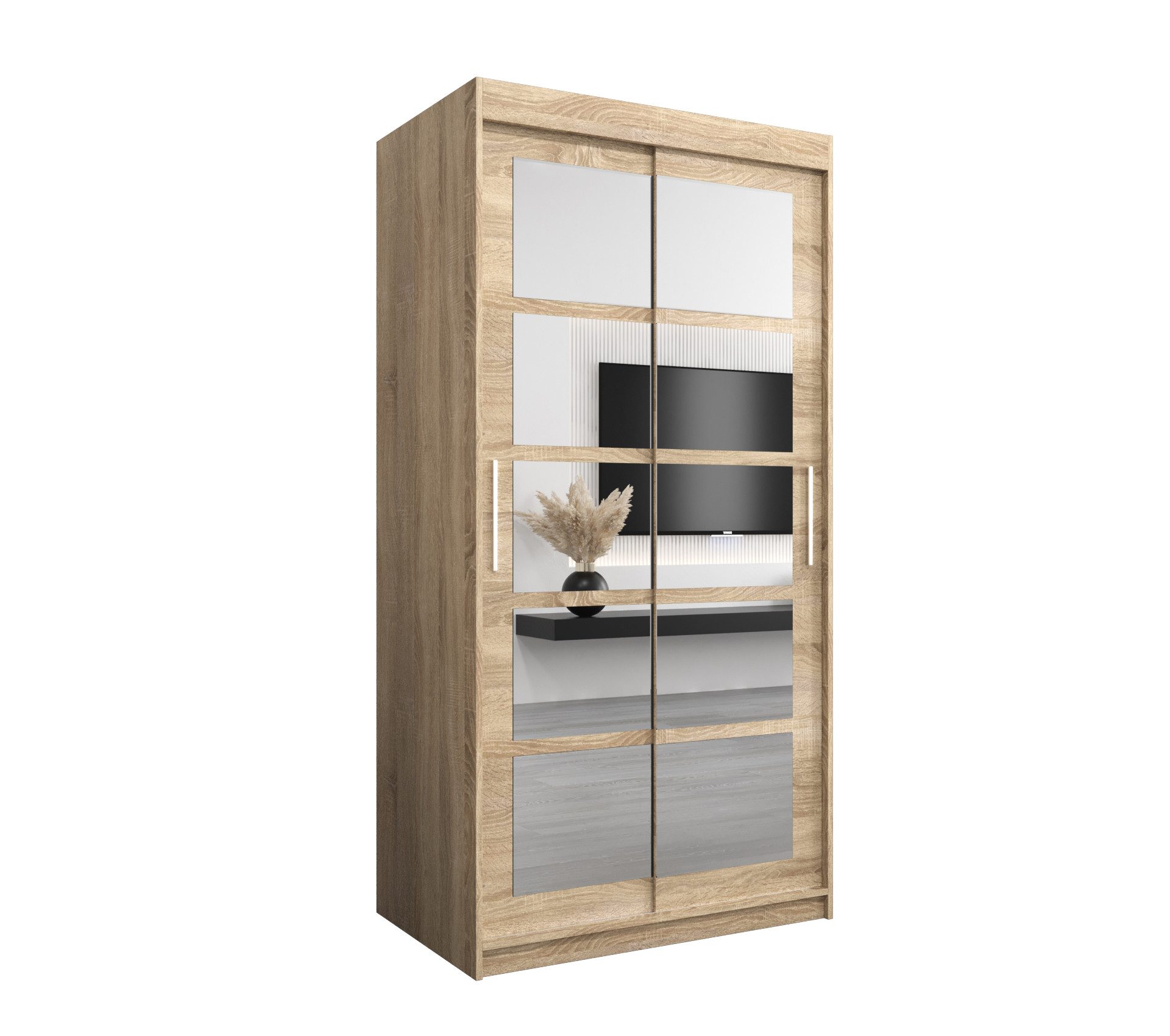 Langlebige Materialien: Der Schrank besteht aus 16 mm dickem, massivem Laminat, während die Kanten sorgfältig mit langlebigem und beschädigungsbeständigem 0,5 mm starkem PVC-Furnier versehen wurden. Die Vorderseite ist mit einem polierten Spiegel versehen und die Griffe sind aus Kunststoff. Der Schrank ist mit Schiebetüren auf Aluminiumschienen ausgestattet.