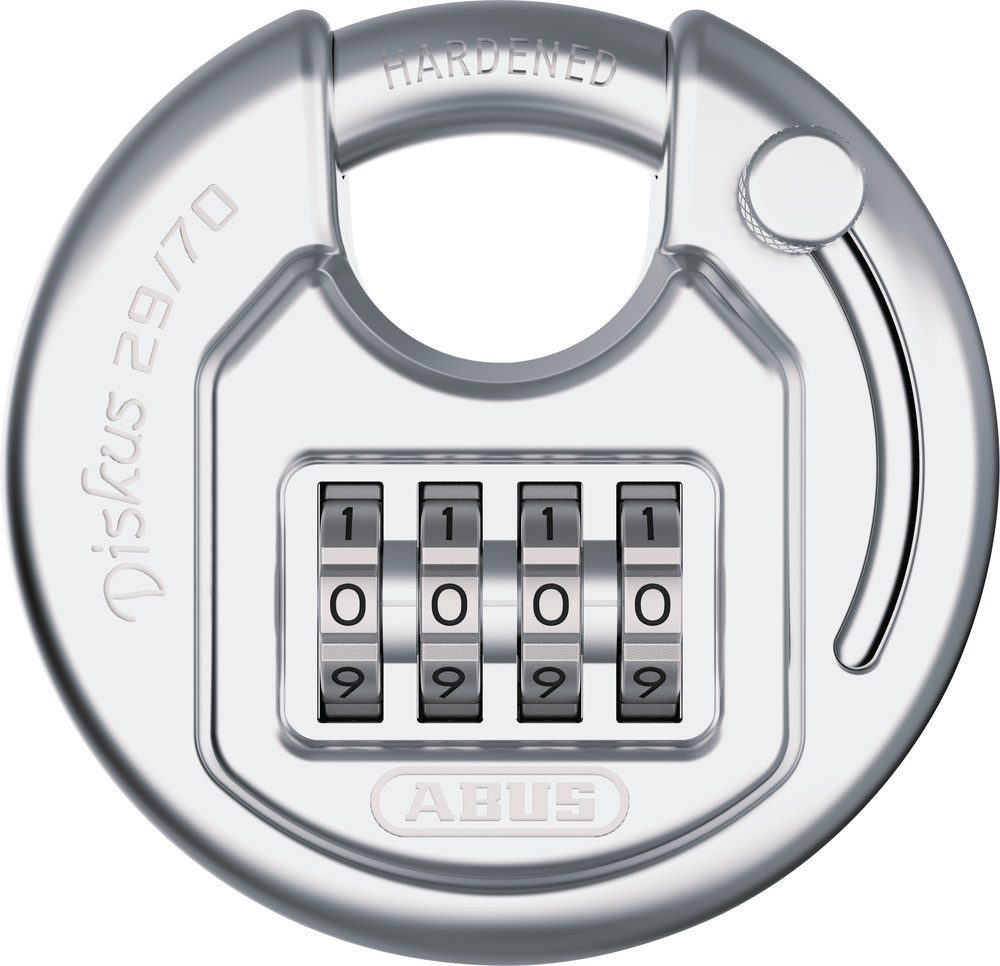 Das ABUS Diskus Combo 29/70 ist ein widerstandsfähiges Vorhängeschloss in Rundform mit 4-stelligem Zahlencode. Die geschlossene Bauweise erschwert Angriffe mit Bolzenschneider oder Werkzeugen. Das Gehäuse besteht aus korrosionsbeständigem Edelstahl, der Bügel aus gehärtetem Stahl. Das Schloss ist für den Innen- und Außenbereich geeignet und ermöglicht ein schlüsselloses Öffnen durch den individuell einstellbaren Code.