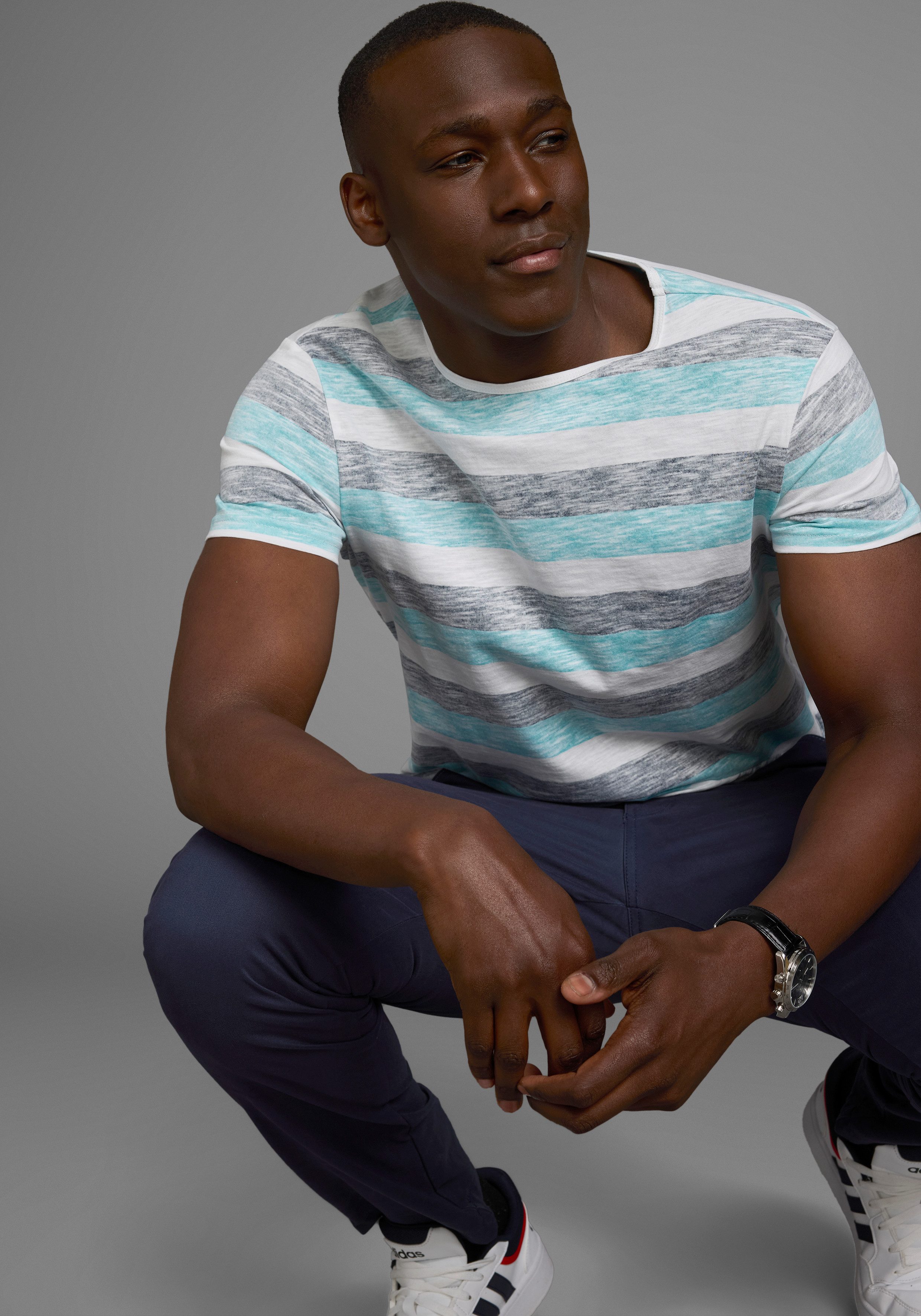 Mit dem T-Shirt von AJC bist du stilsicher unterwegs und gibst deinem Look den letzten Schliff. Das Streifenmuster macht das Shirt nicht nur zum Lieblings-Basic für deine Outfits, sondern bringt auch Dynamik und eine sportliche Note mit sich. Dieses Shirt hat einen Rundhalsausschnitt und ist schmal geschnitten, sodass dein Oberkörper dezent in Szene gesetzt wird.