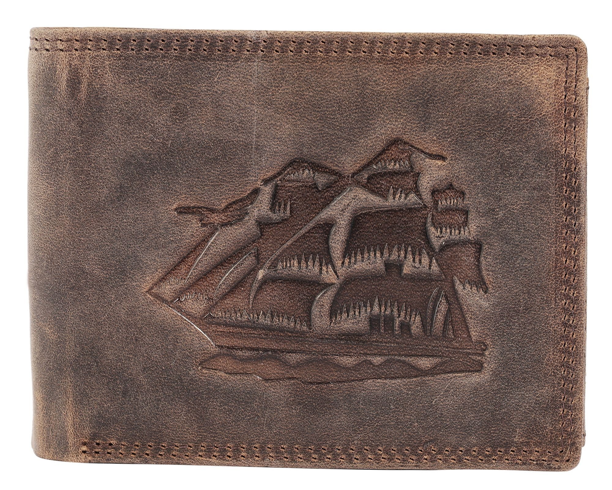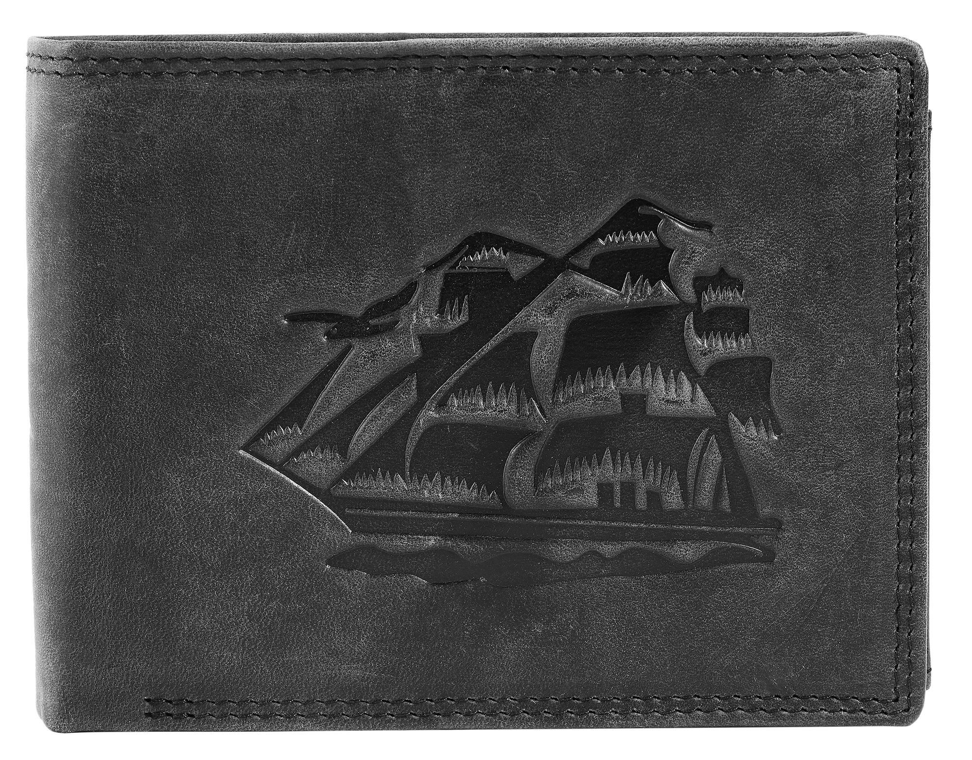 Die Geldbörse der Marke Akzent wurde im Querformat aus Echtleder hergestellt und zeigt sich durch die Prägung in Form eines Segelschiffes im unverkennbarem Design. Die Geldbörse ist ein wahres Platzwunder und bietet viel Stauraum für alle wichtigen Dokumente. Die Doppelnaht im Außen- und Innenbereich sorgt für eine gute Haltbarkeit und Stabilität. Durch die komfortable Einteilung verfügt sie über 6 Kreditkartenfächer, 2 Geldscheinfächer, 1 Münzfach mit Druckknopfverschluss, 1 Reißverschlussfach im inneren Bereich, 2 Einsteckfächer und 3 transparente Ausweisfächer und mittels eines extra Druckknopfverschluss im Innern werden die Karten sicher verwahrt. Die Größe ergibt sich ungefüllt aus einer Länge von 9,5 cm, einer Breite von 12 cm und einer Stärke von 2 cm. Ein tolles Accessoire mit optimaler Größe für den täglichen Gebrauch.