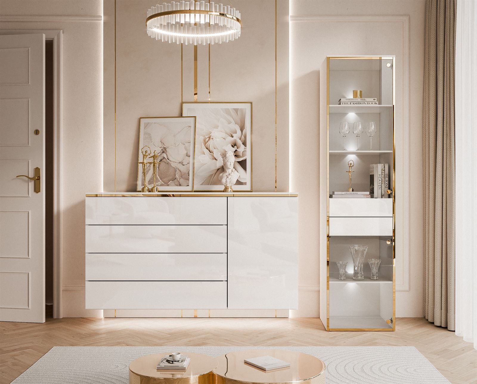 Das Wohnzimmermöbel-Set PEONY II begeistert mit einer edlen Glasfront und dezenten goldenen Akzenten, die dem Raum eine außergewöhnliche Eleganz verleihen. Jedes Element wurde mit höchster Sorgfalt gestaltet, um Funktionalität und modernes Design perfekt zu vereinen. Das Ergebnis ist ein harmonisches Gesamtbild, das sich nahtlos in minimalistische und stilvolle Wohnkonzepte einfügt.