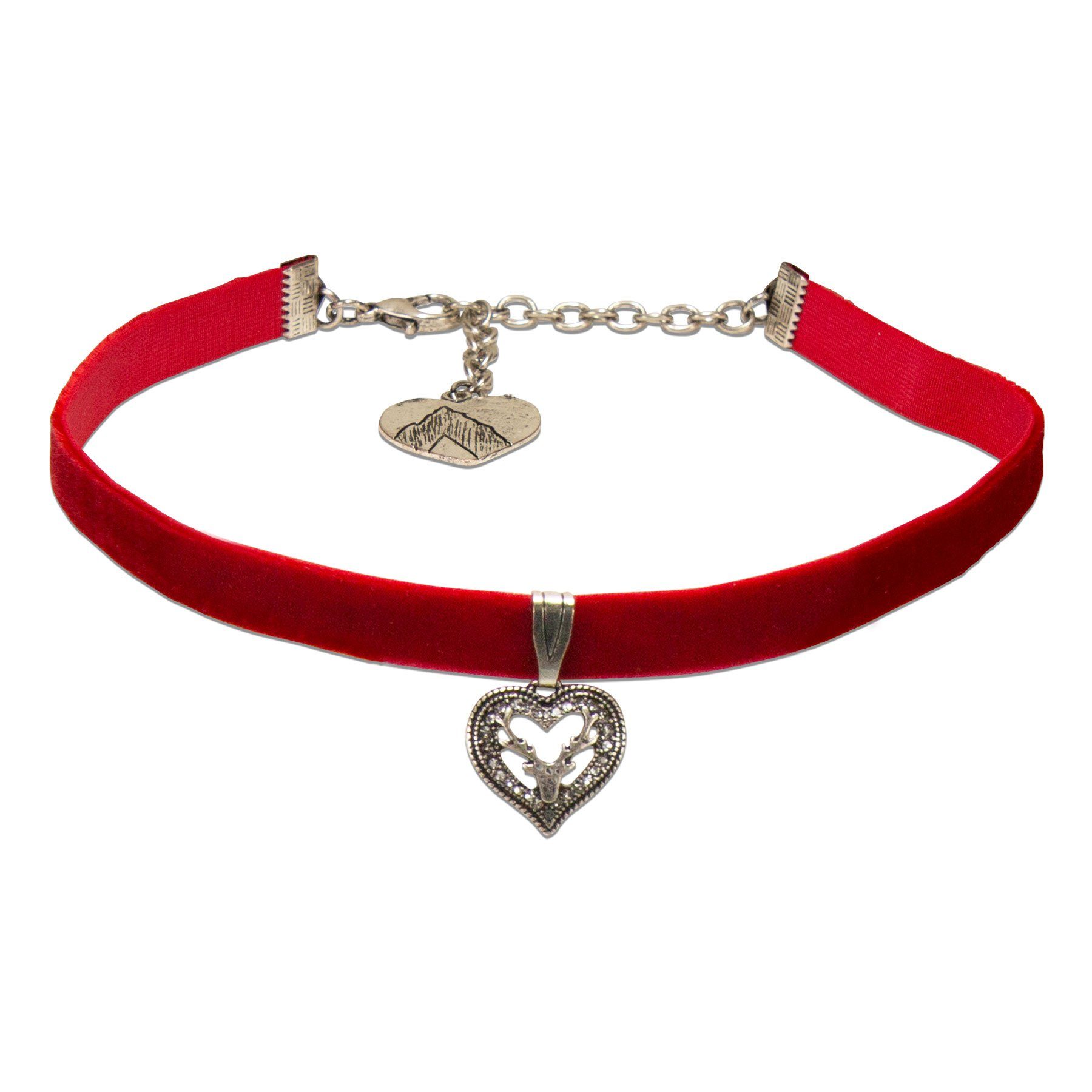 Länge Trachten Halskette: ca. 30 cm + 7 cm Verlängerungs-Kette, Breite Samtband mit Anhänger Strassherz-Hirsch: 1 cm