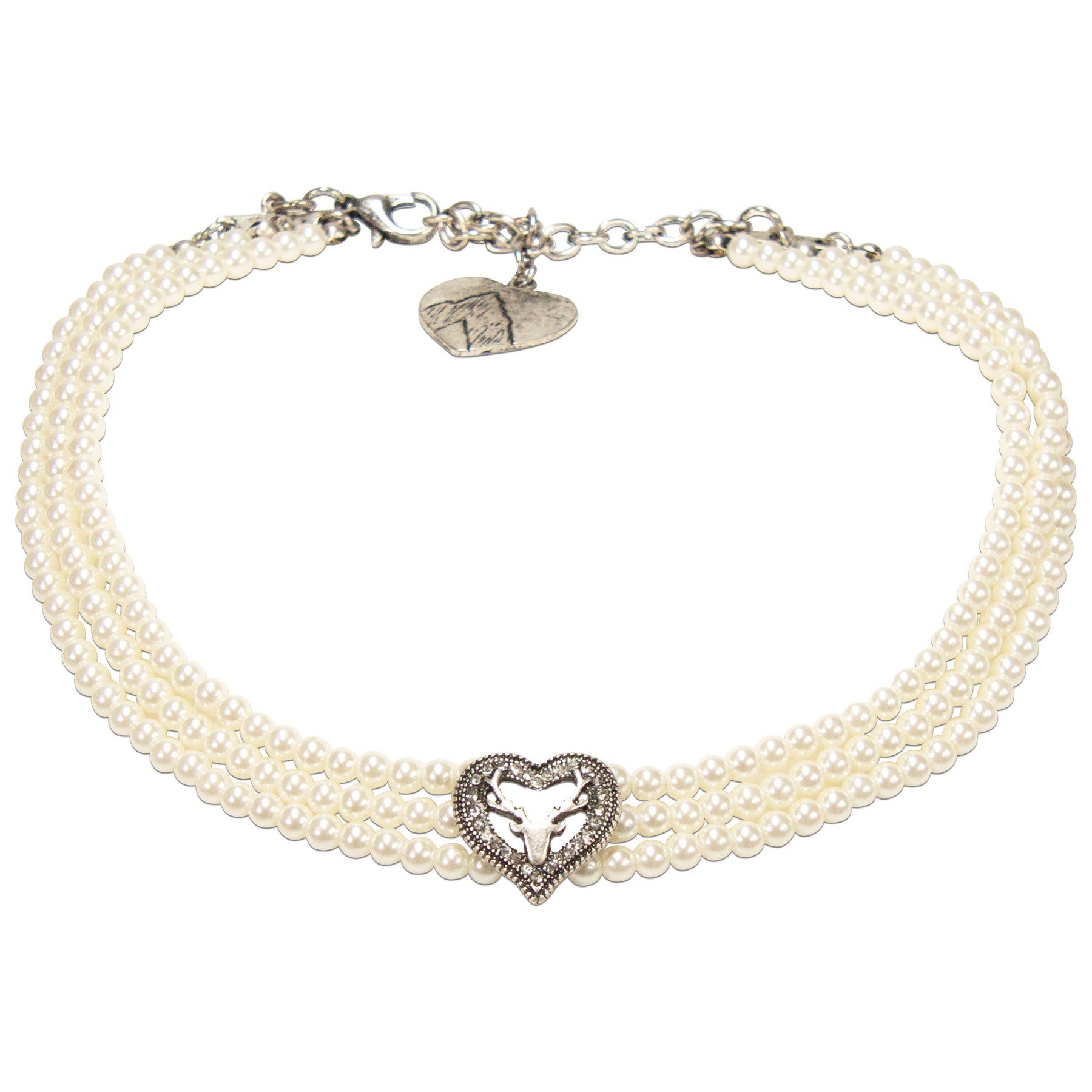 Trachten-Perlen-Kropfkette Strassherz-Hirsch: Liebevolle 3-reihige Perlen-Kropfkette aus kleinen Perlen. Das antik-silber-farbene Herz mit Hirsch ist mit Strass-Steinen verziert. Eine elegante Dirndlkette und zeitlos schön.