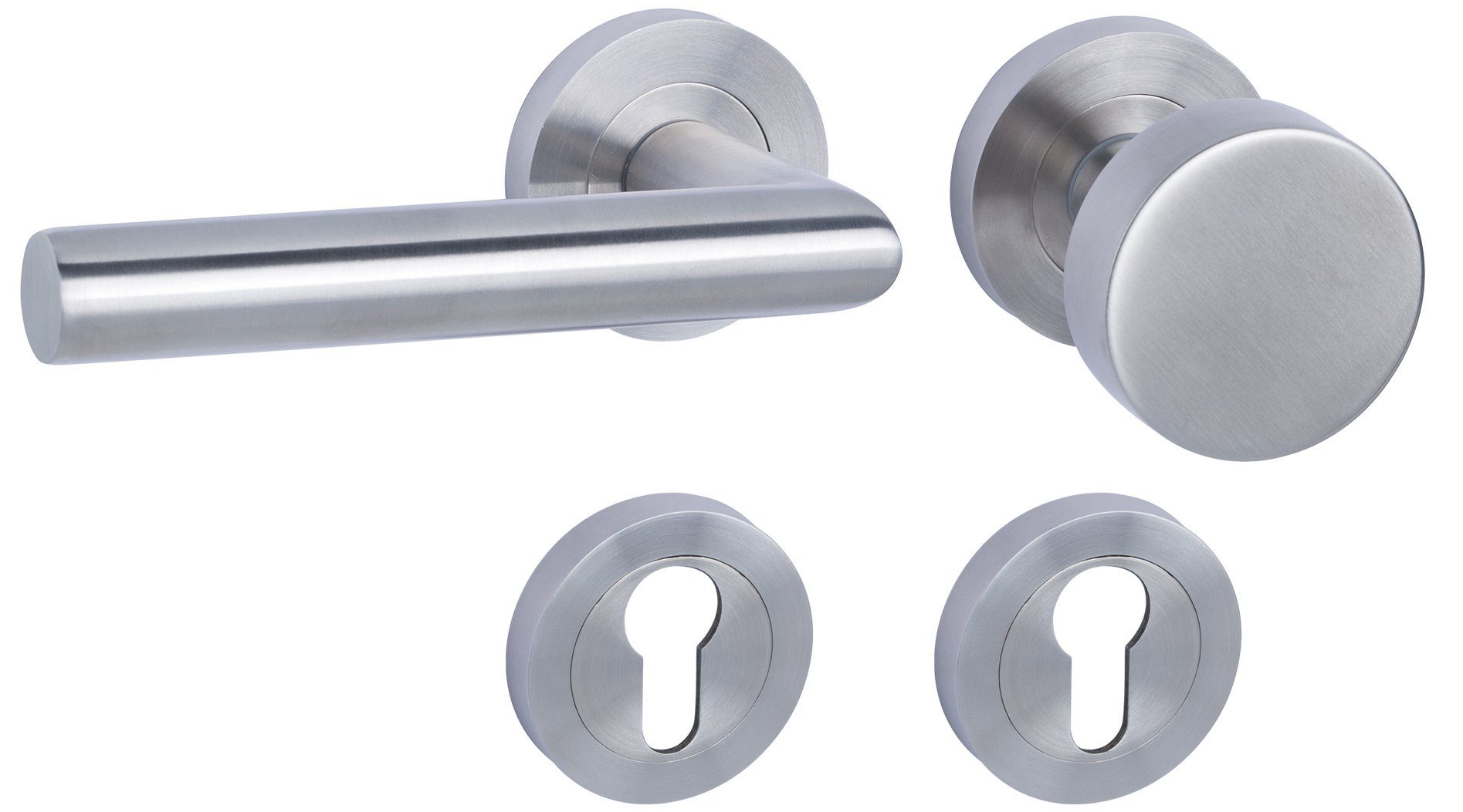Moderne Rosettengarnitur aus hochwertigem Edelstahl satiniert für Wohnungseingangstüren mit Profilzylinderlochung DIN links, Knopf/Drücker