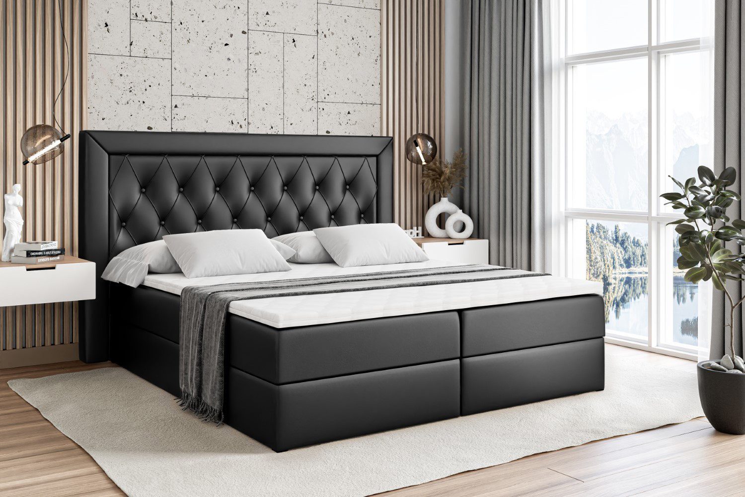 Das Boxspringbett ist ein Garant für einen langen, tiefen Schlaf und erholsame Nächte. Das Bett ist mit zwei Bettkästen ausgestattet, die viel Platz für Bettwäsche und Kissen bieten und für ein aufgeräumtes Schlafzimmer sorgen. Der verwendete Polsterstoff ist strapazierfähig und langlebig