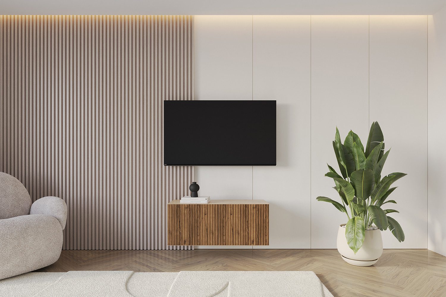 Die hängende TV-Kommode ist die perfekte Lösung für ein zeitgemäßes Raumkonzept, das den TV-Schrank zum Mittelpunkt des Wohnraums macht und eine elegante, edle Atmosphäre schafft. Das ansprechende Design des TV-Möbels überzeugt durch verschiedene Motive, Farben, pflegeleichte Materialien und sorgfältige Verarbeitung.