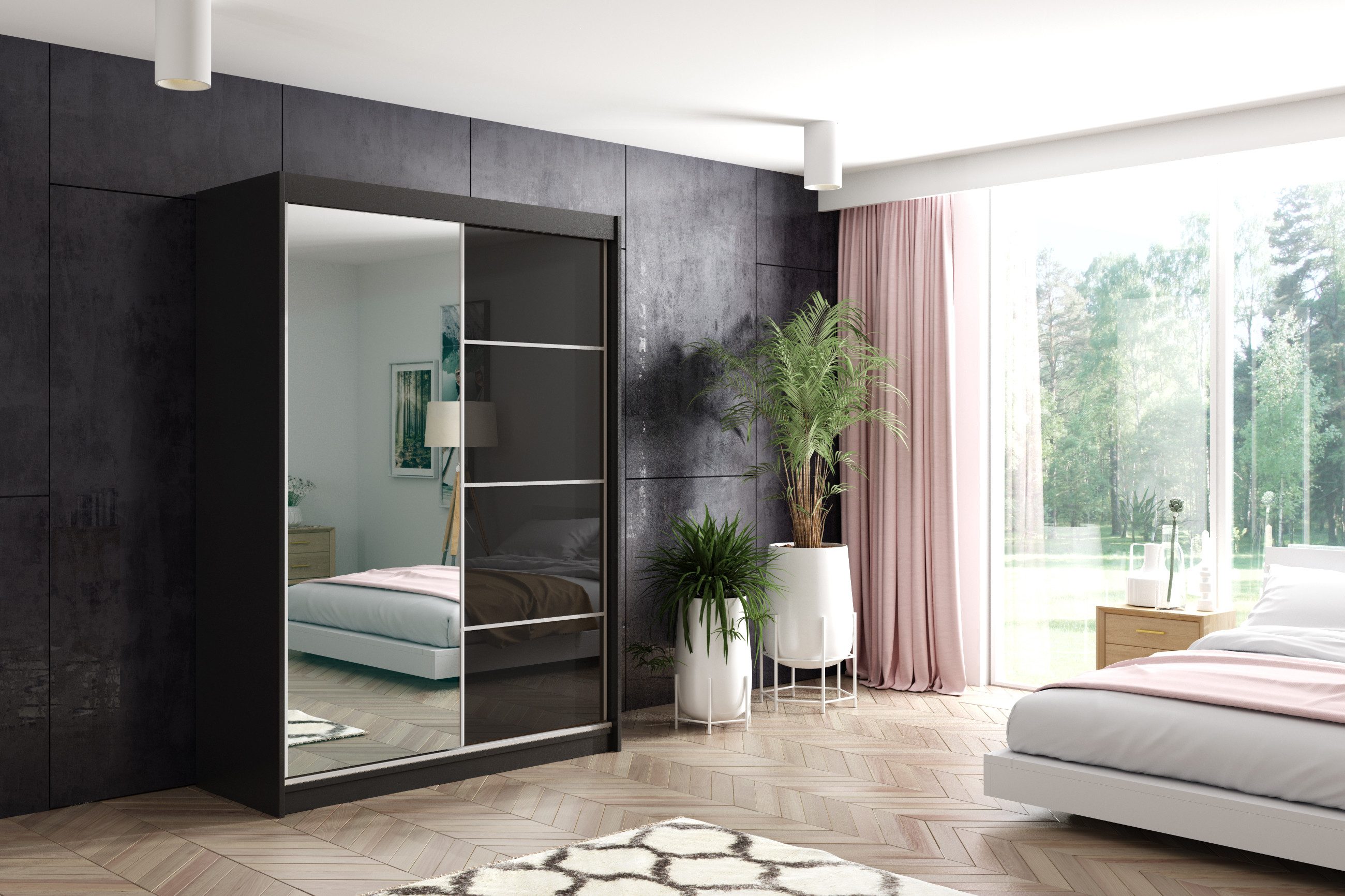 Die verspiegelten Fronten vergrößern visuell das Zimmer und verleihen dem Schrank eine optische Leichtigkeit.