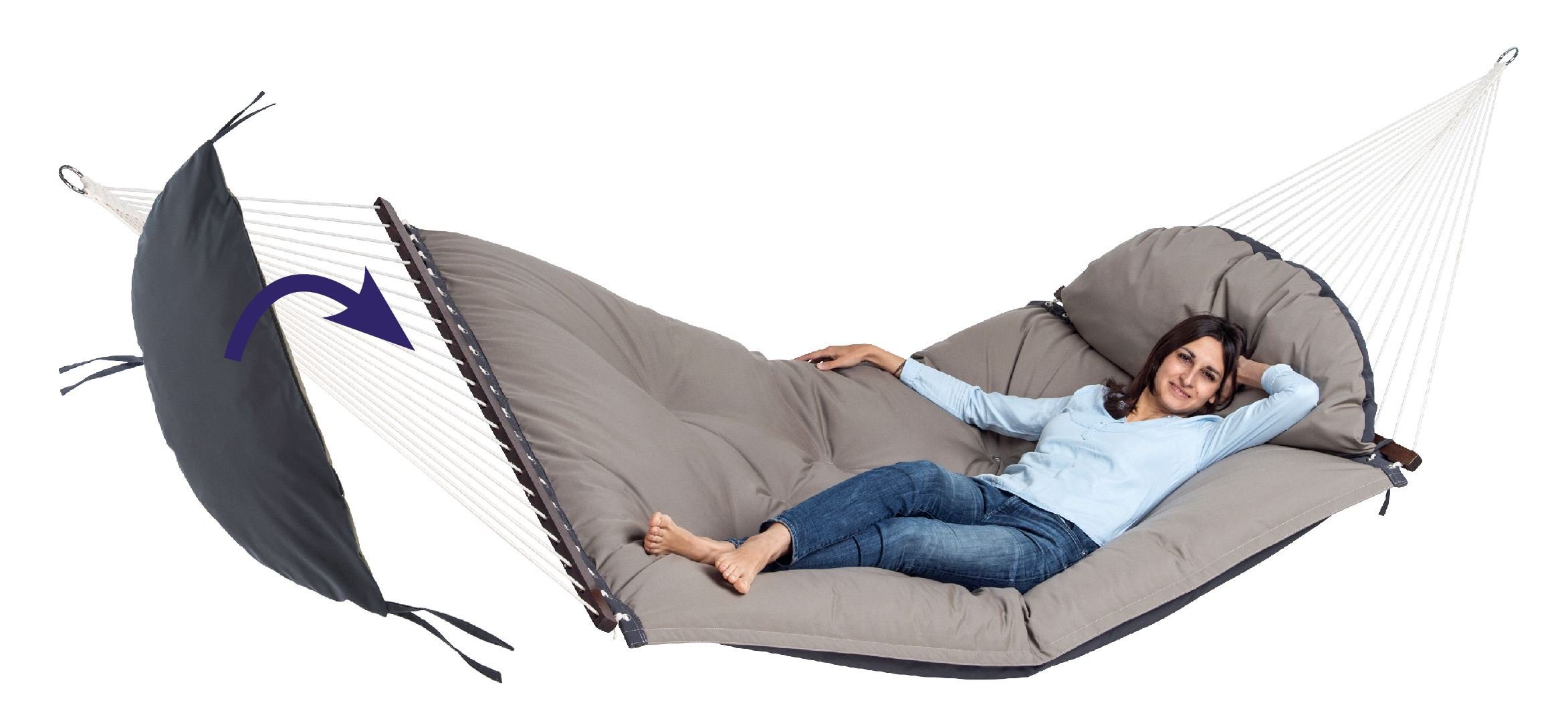 Zweites Kissen für die Fat Hammock – Erweiterung für Luxushängematte Unser zweites Kissen für die Fat Hammock wurde konzipiert, um die bereits großzügige Liegefläche dieser luxuriösen Hängematte weiter zu vergrößern. Es ermöglicht eine komfortable Einbettung deines Kopfes, damit du dich in eine tiefe Phase der Entspannung begeben kannst. Die Anbringung des Kissens an der Fat Hammock gestaltet sich denkbar einfach – die Schnüre werden einfach am Stab festgeknotet. Der äußerst strapazierfähige agora-Stoffbezug zeichnet sich durch außergewöhnliche Widerstandsfähigkeit aus. Er ist so weich wie Baumwolle, besitzt eine hohe Licht- und Witterungsbeständigkeit (Lichtechtheit: 7/8), ist wasserabweisend und trocknet besonders schnell. Zudem ist der Bezug schimmelresistent, schmutzunempfindlich und pflegeleicht – Verschmutzungen können problemlos abgebürstet oder abgesaugt werden. Der Stoffbezug lässt sich mittels Reißverschluss leicht abnehmen und waschen. Die extra dicke, wasserabweisende Polsterung sorgt für die perfekte Entspannung. Das Füllmaterial besteht aus recycelten Materialien, darunter wiederaufbereitete PET-Flaschen. Im Lieferumfang enthalten ist das Zweitkissen, das deine Fat Hammock zu einem noch komfortableren Ort der Erholung macht. Erfreue dich an zusätzlichem Komfort und erweitere dein Hängemattenerlebnis mit dem hochwertigen Zweitkissen für die Fat Hammock.