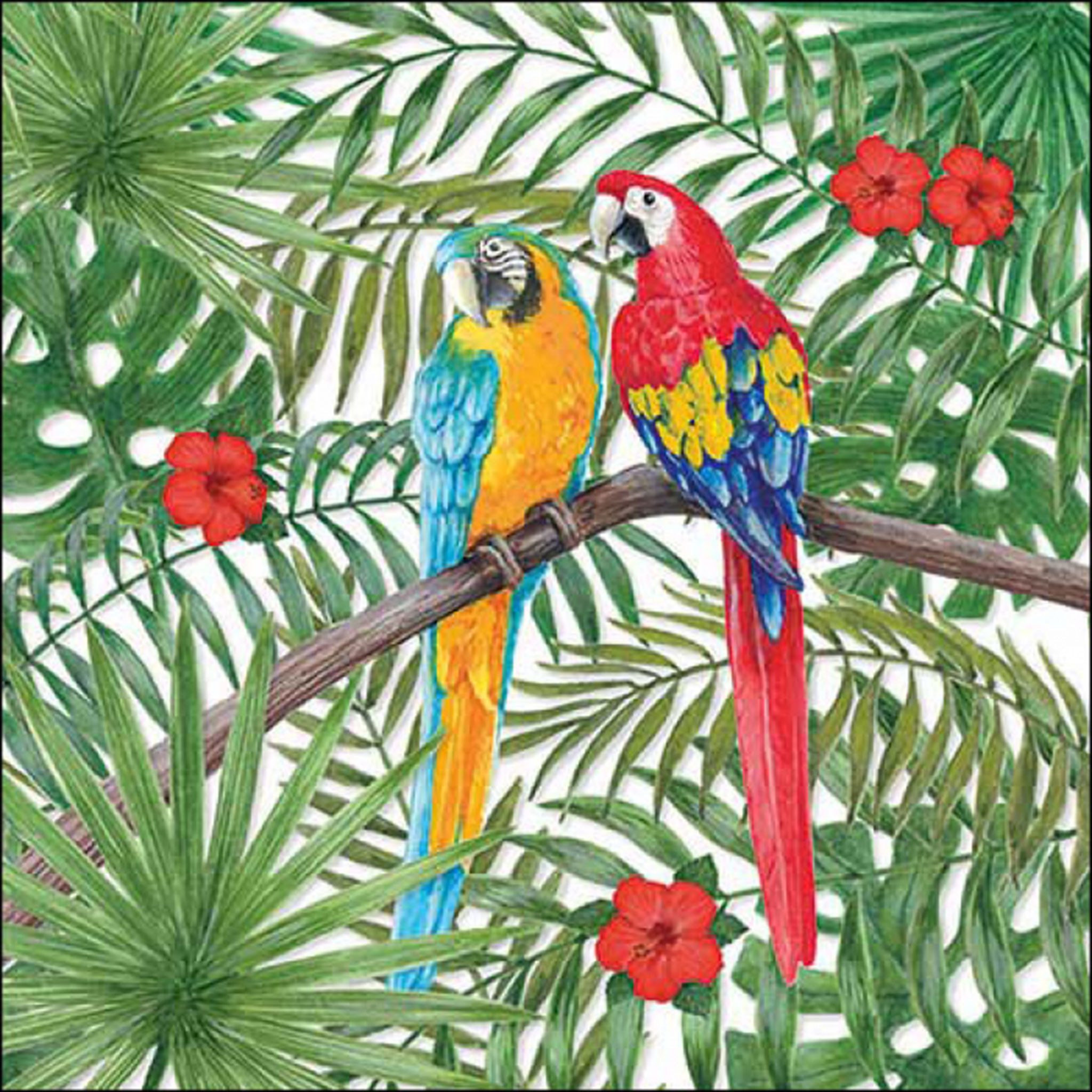 PRODUKT: Einweg Papierservietten mit Papageien & Tropenblätter Motiv / MATERIAL: Tissue - Papier, FSC zertifiziert / GRÖSSE: ca. 33 x 33 cm (entfaltet) bzw. 16,5 x 16,5 cm