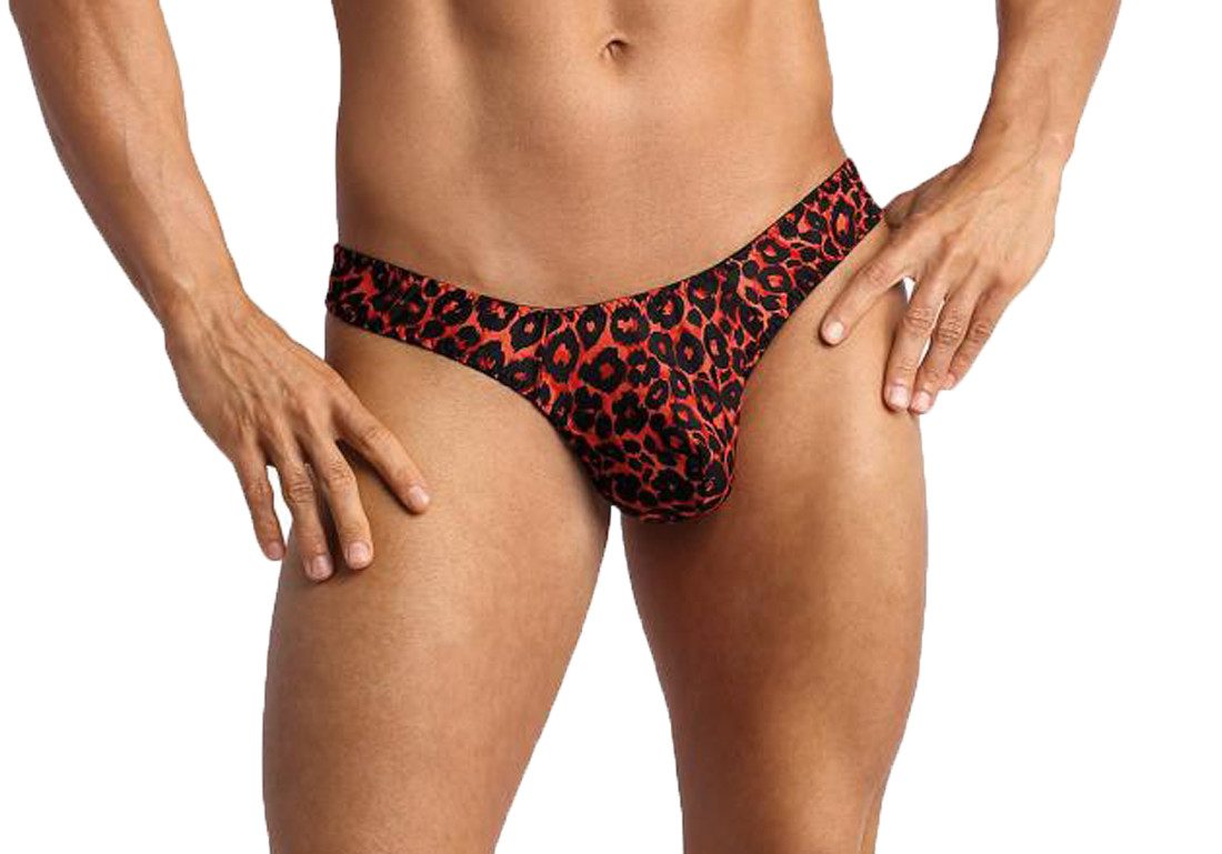 String Tanga rot schwarz, gefertigt aus glattem, halbtranparenten Stoff, mit Leo Print.