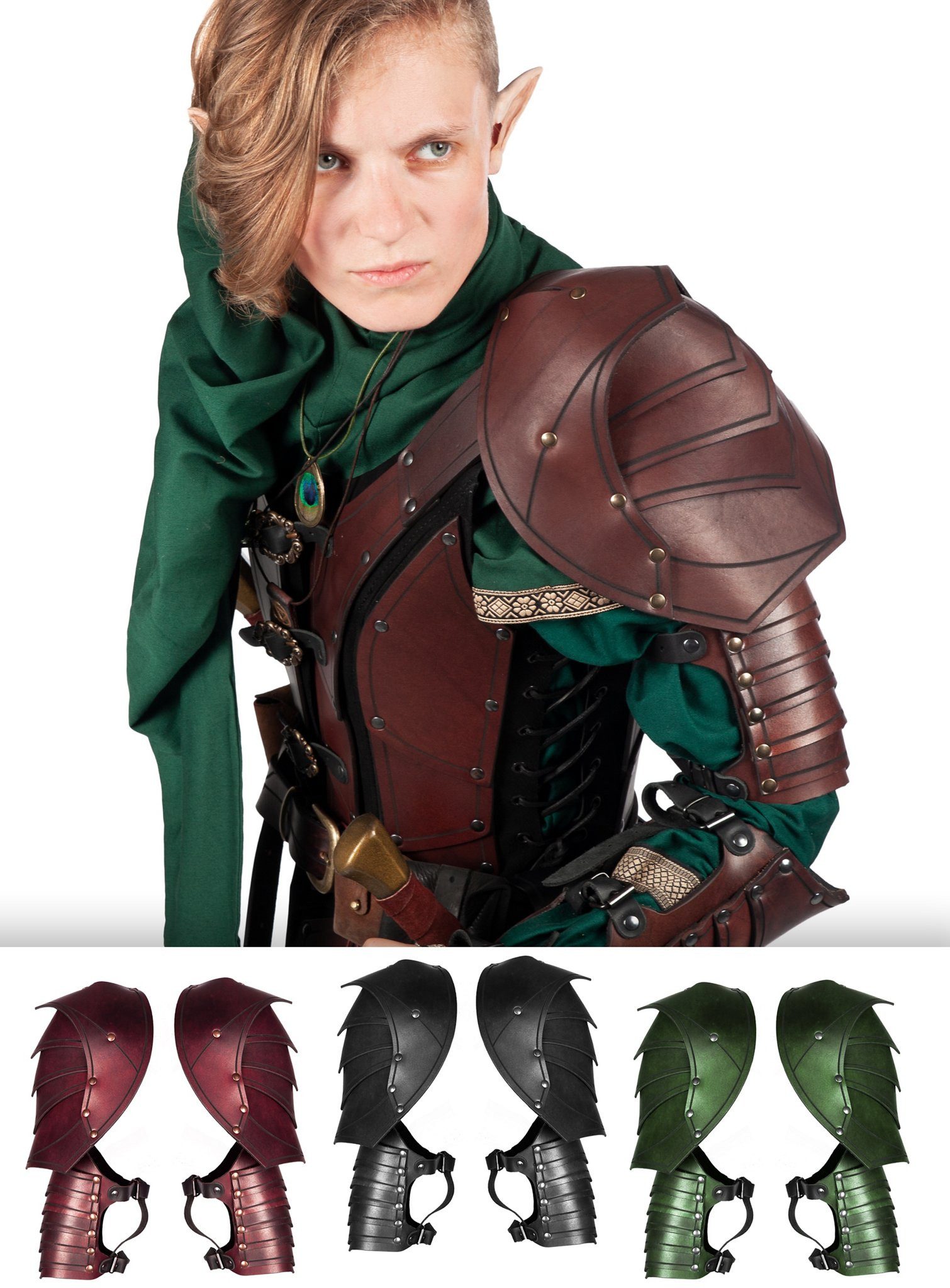 Unsere Lederschultern - Drachenrücken bieten wirklich massiven Rüstungsschutz ohne dabei zu wuchtig zu wirken. Sie bestehen aus zwei Segmenten, die mit einer Schnalle verbunden sind. Dadurch lassen sie sich sehr flexibel auf verschiedene Armlängen einstellen. Das untere Segment besteht aus mehreren aufgenieteten Platten und ist dadurch an vielen Stellen bis zu 1 cm dick. Zusätzlich entsteht ein Hohlraum zwischen der Platte und den Schuppen der Schläge extrem abdämpft. Auch das Schulterstück selbst umschließt die Schulter komplett und bietet echten Schutz vor Angriffen. Die Schultern lassen sich mit jeder Andracor Torso Lederrüstung oder Kragen kombinieren, passen aber optisch am besten zu unseren elfisch inspirierten Lederteilen.