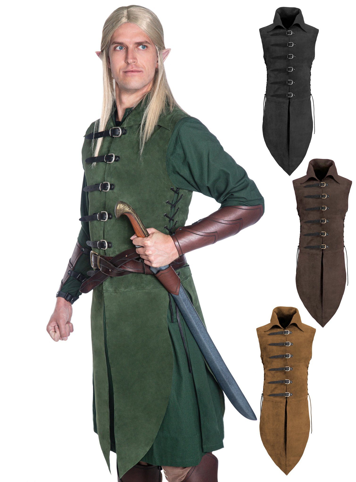 So ein Lederwams ist eine feine Sache, nicht nur für Waldelfen: Er sieht mit seinem Kragen sehr schick aus, lässt sich mit vielen anderen Kleidungsstücken oder Rüstungsteilen kombinieren, sitzt angenehm am Körper und bietet ein ansprechendes Maß an Bewegungsfreiheit. Der Wams ist von Hand aus echtem Veloursleder gefertigt, er wird mithilfe der sechs Schnallen und sechs verstellbaren Riemen auf der Vorderseite verschlossen. Die seitlichen Schnürungen, deren Löcher mit stabilen Metallösen verstärkt sind, um ein Ausfransen bzw. Ausreißen der Löcher zu verhindern, dienen der individuellen Anpassung an den Körperumfang des Trägers.