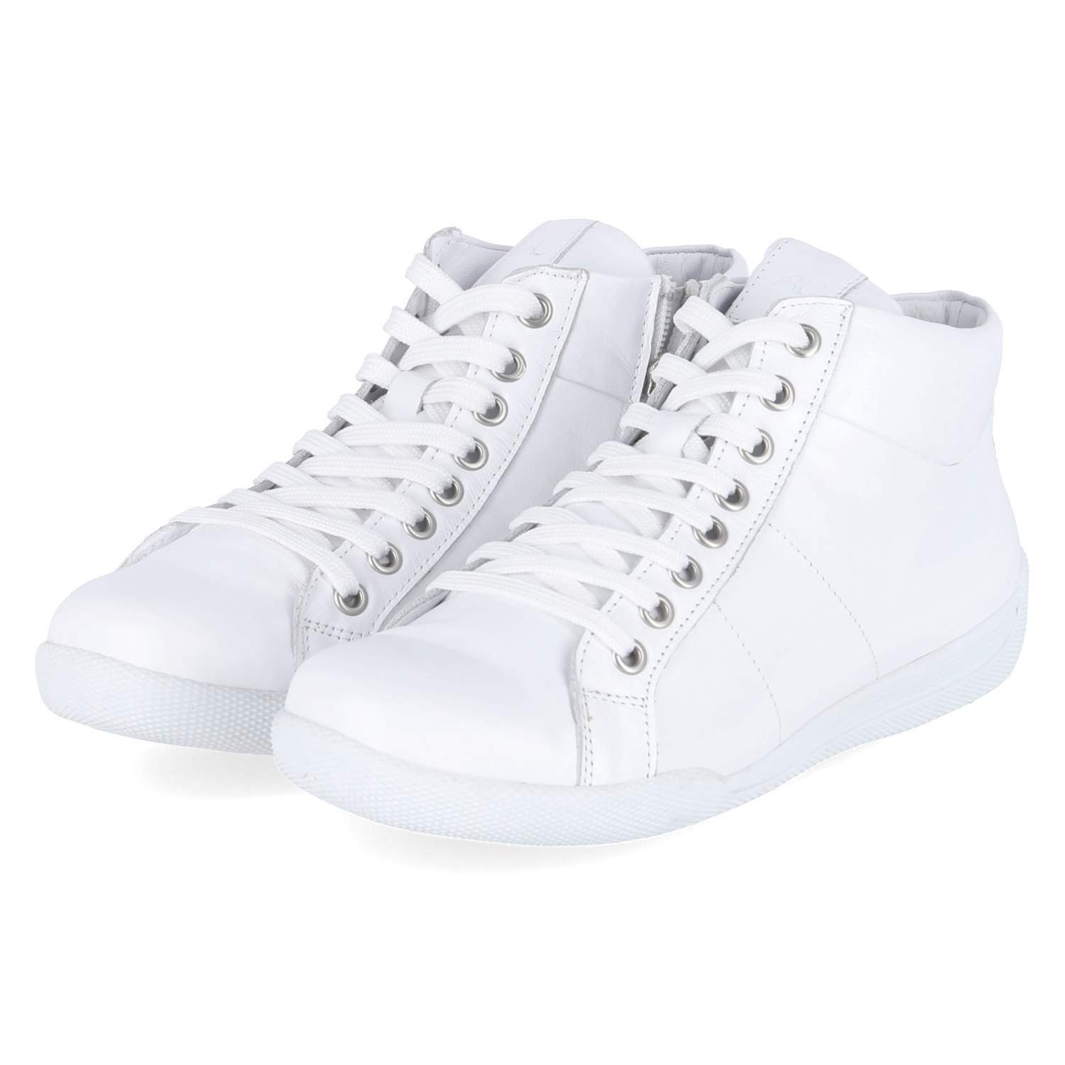 Andrea Conti Damen Stiefeletten aus weißem Glattleder bestechen durch ihr sportliches Design und bieten gleichzeitig hohen Komfort. Die Schnürung und der Reißverschluss ermöglichen eine individuelle Passform, während der leicht gepolsterte Einstieg und das Lederfutter für ein angenehmes Tragegefühl sorgen. Die gepolsterte, herausnehmbare Lederdecksohle bietet zusätzlichen Komfort. Der verstärkte Fersenbereich sorgt für Stabilität, und die sehr flexible, rutschhemmende Laufsohle gewährleistet sicheren Halt. Diese Stiefeletten lassen sich hervorragend zu sportlichen Looks kombinieren – zum Beispiel mit einer Jogginghose oder Jeans und einem casual T-Shirt oder Pullover für einen lässigen, modernen Style.