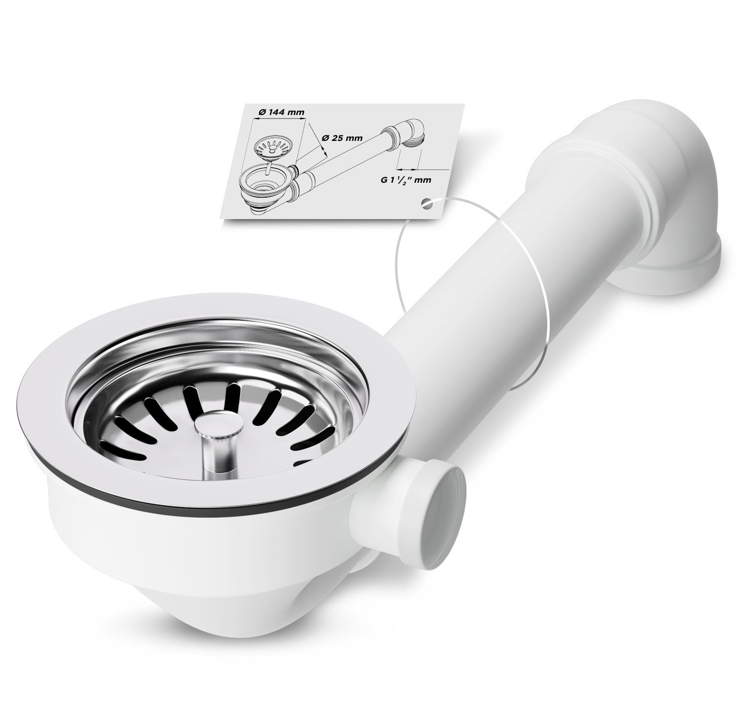 Technische Daten von den Anschlüssen: - Durchmesser vom Überlaufeingang seitlich: 25 mm (1 Zoll) - Durchmesser vom Siebkorbeinsatz: 114 mm (3 1/2 Zoll) - Durchmesser vom Raumschaffer/Raumsparrohr: 40 mm (1 1/2 Zoll) - Material vom Siebkorb und Einsatzkelch: Edelstahl - Material vom Gehäuse und den Rohren: weißer Kunststoff