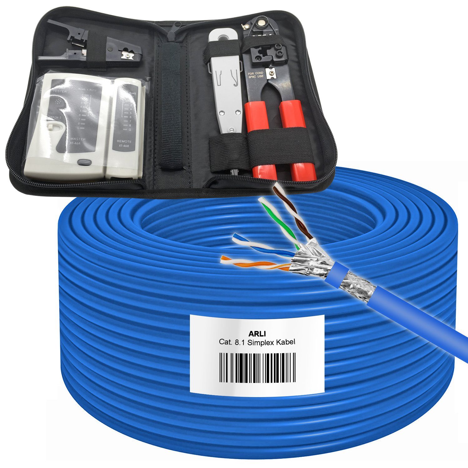 ARLI 100m Cat8.1 Verlegekabel + 4-in-1 Netzwerk-Werkzeugset – Crimpzange, LSA-Werkzeug, Netzwerktester & Abisolierer