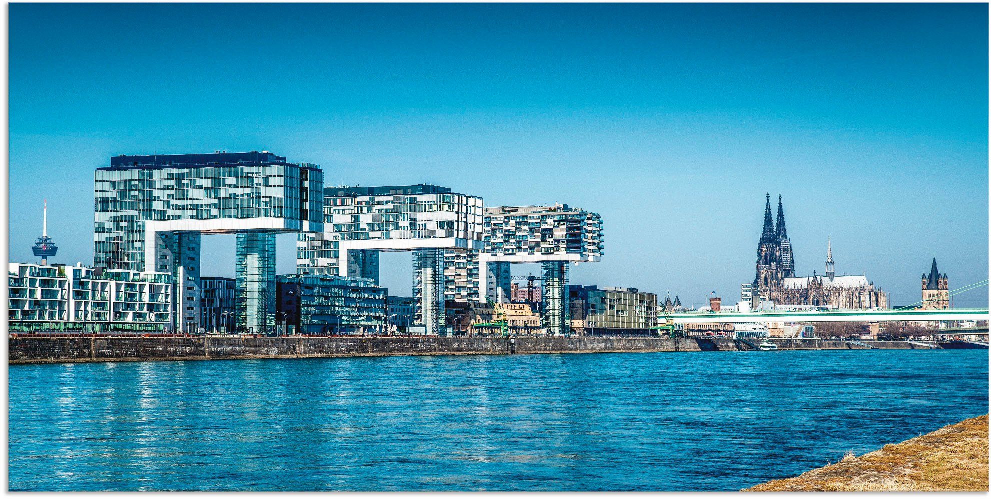 Mit viel Liebe für kunstvolles Wohnen verleiht unser Wandbild mit dem Motiv Köln Kranhäuser und Dom von David Engel Deinem Zuhause Charakter. Es begeistert durch hochauflösende Druckqualität und hochwertige Materialien – Made in Germany.