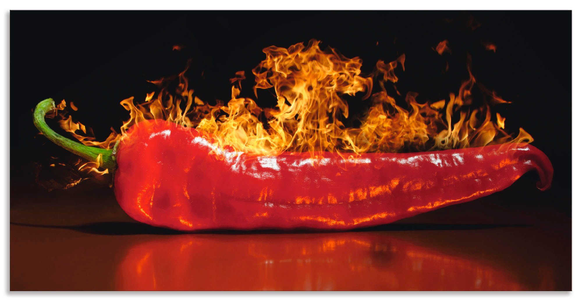Mit viel Liebe für kunstvolles Wohnen verleiht unser Wandbild mit dem Motiv Roter scharfer Chilipfeffer, sehr scharf - Feuer Flammen von Andrei Rybachuk Deinem Zuhause Charakter. Es begeistert durch hochauflösende Druckqualität und hochwertige Materialien – Made in Germany.
