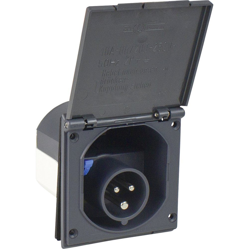Hochwertige CEE-Einspeisestecker zur Selbstmontage. CEE Einspeisungsstecker 230 V, 16 A, 3-polig mit Klappdeckel. Flanschmaß HxB in mm: 110x104. Lochabstand HxB in mm: 90x77,5. Einbautiefe in mm: 82. CEE 230 V, 16 A, 3-polig, 6 h. IP44: fremdkörper- und spritzwassergeschützt
