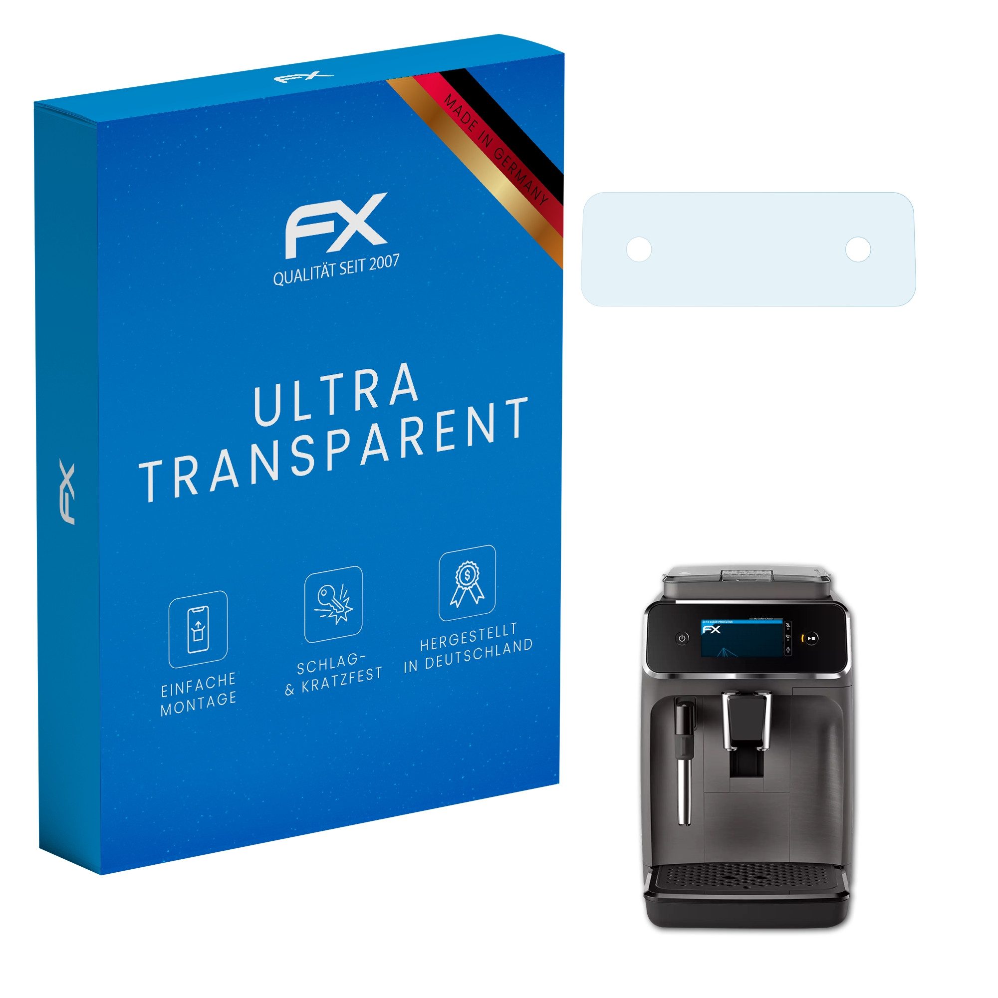 | Lieferumfang | 2 x FX-Clear Folie kompatibel mit Philips Series 2200 (EP2224/10), Reinigungstuch, Montagewerkzeug (Rakel), Link zur mehrsprachigen, bebilderten Montageanleitung (inkl. Montagevideo), Bei Geräten mit mehreren Displays (z.B. Innen- und Außendisplay), ist für jedes Display eine Schutzfolie in der Verpackung enthalten. |